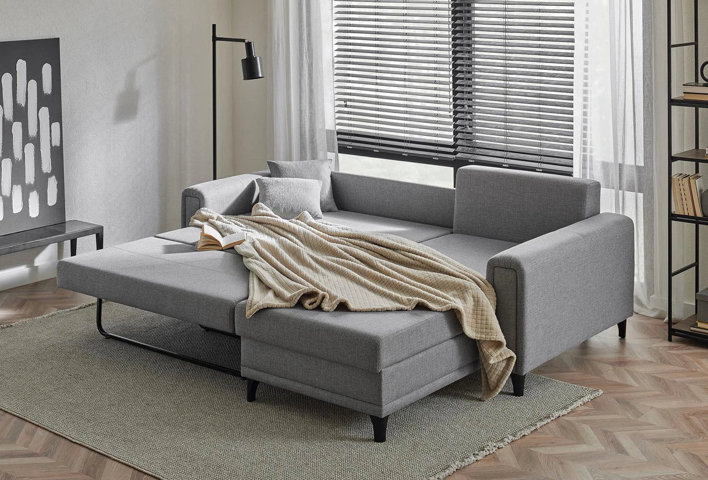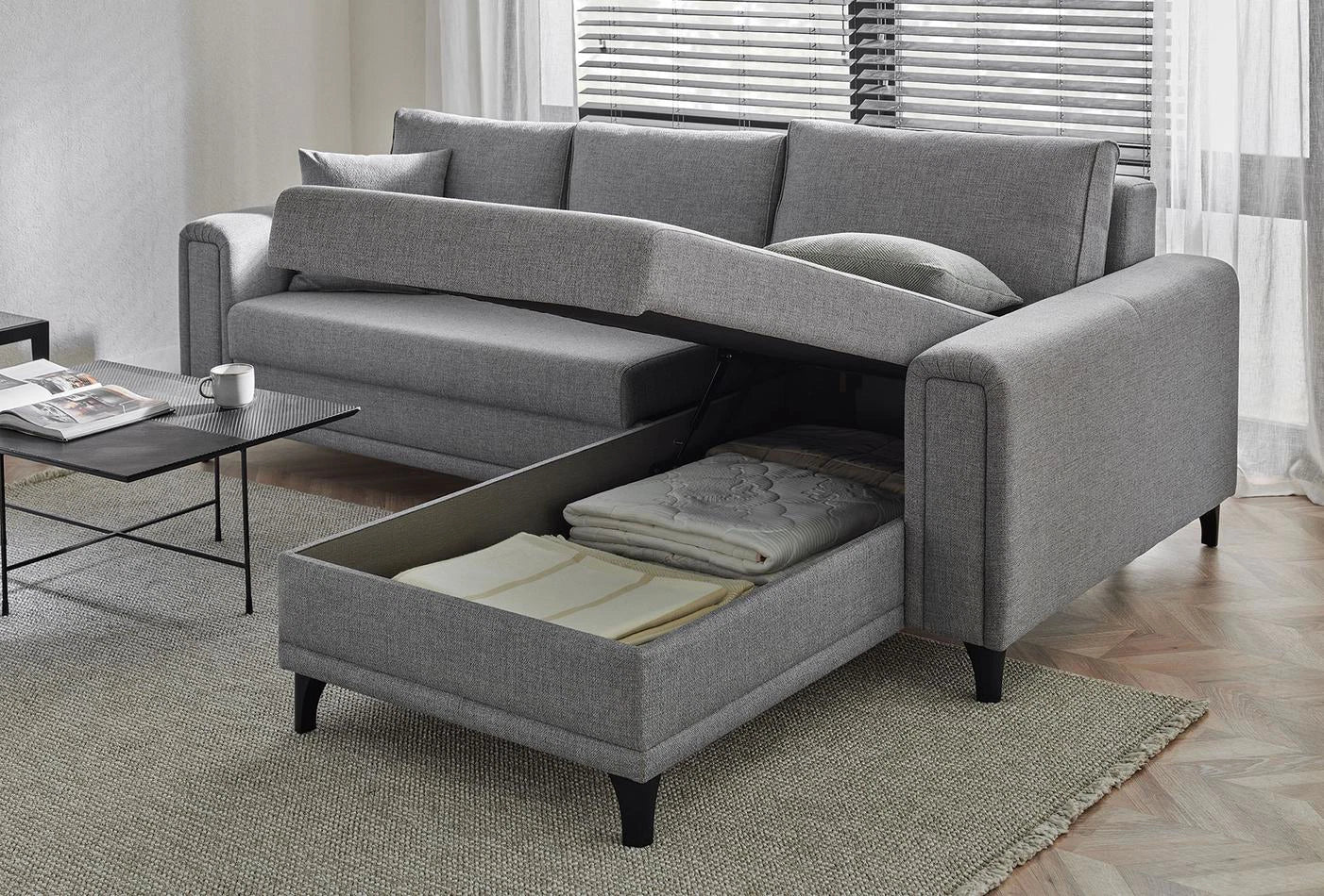 Könnyedén franciaággyá alakítható, ágyneműtartója pedig extra tárolóhelyet biztosít. Az egyszerűen tisztítható, letörölhető szövet és a magas lábak a takarítást teszik egyszerűbbé.