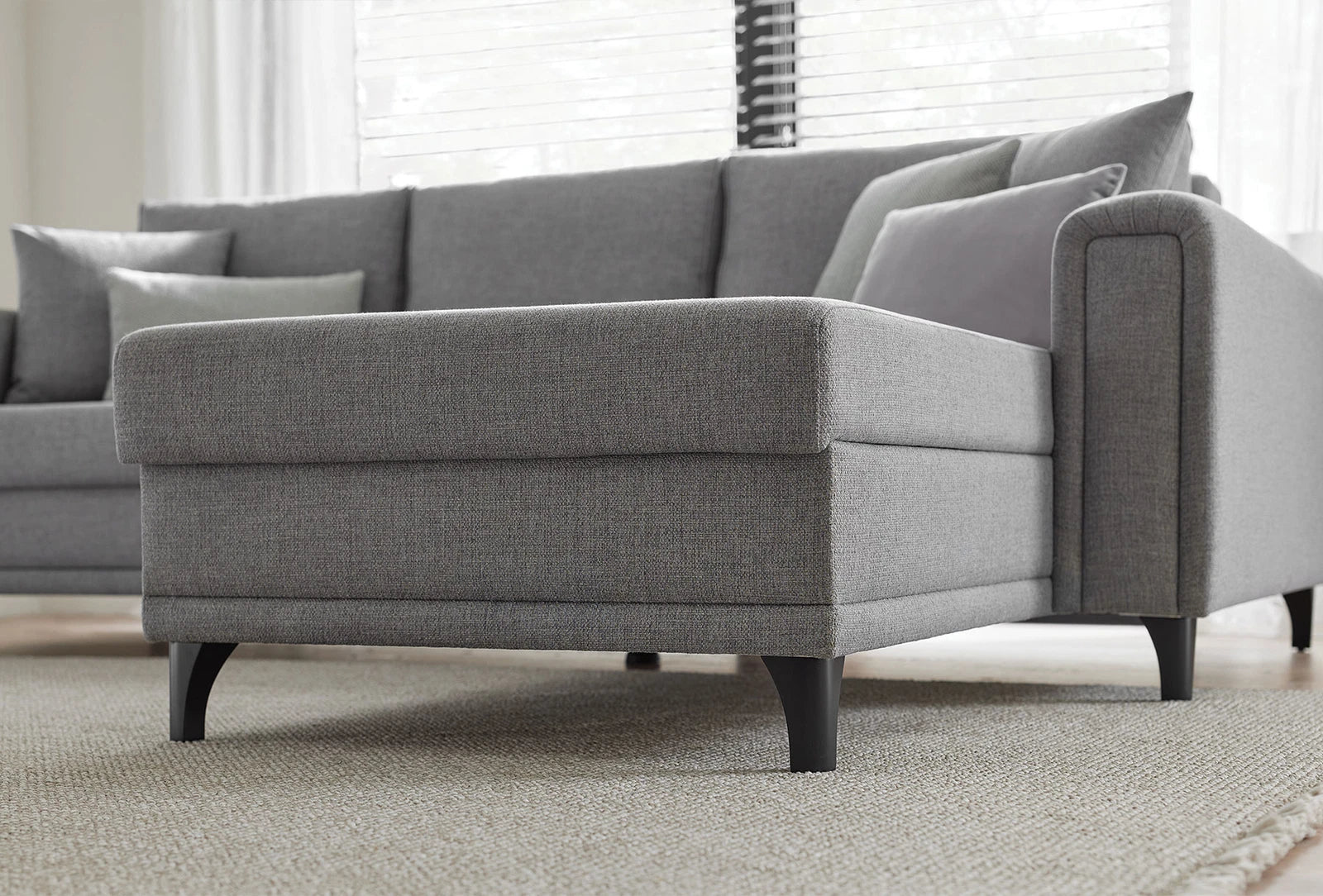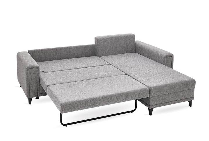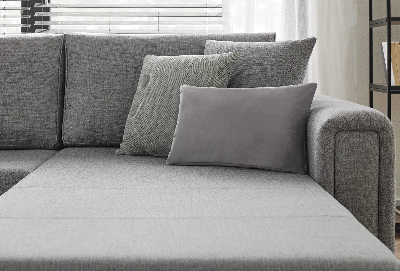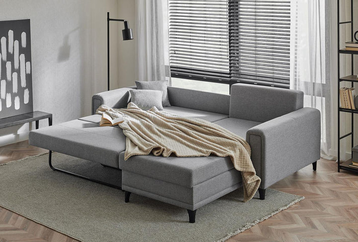 A nagyméretű ággyá alakítható MARIS kanapéágy a dizájnelemeként beépített ágyneműtartónak köszönhetően extra tárolóhelyet kínál.