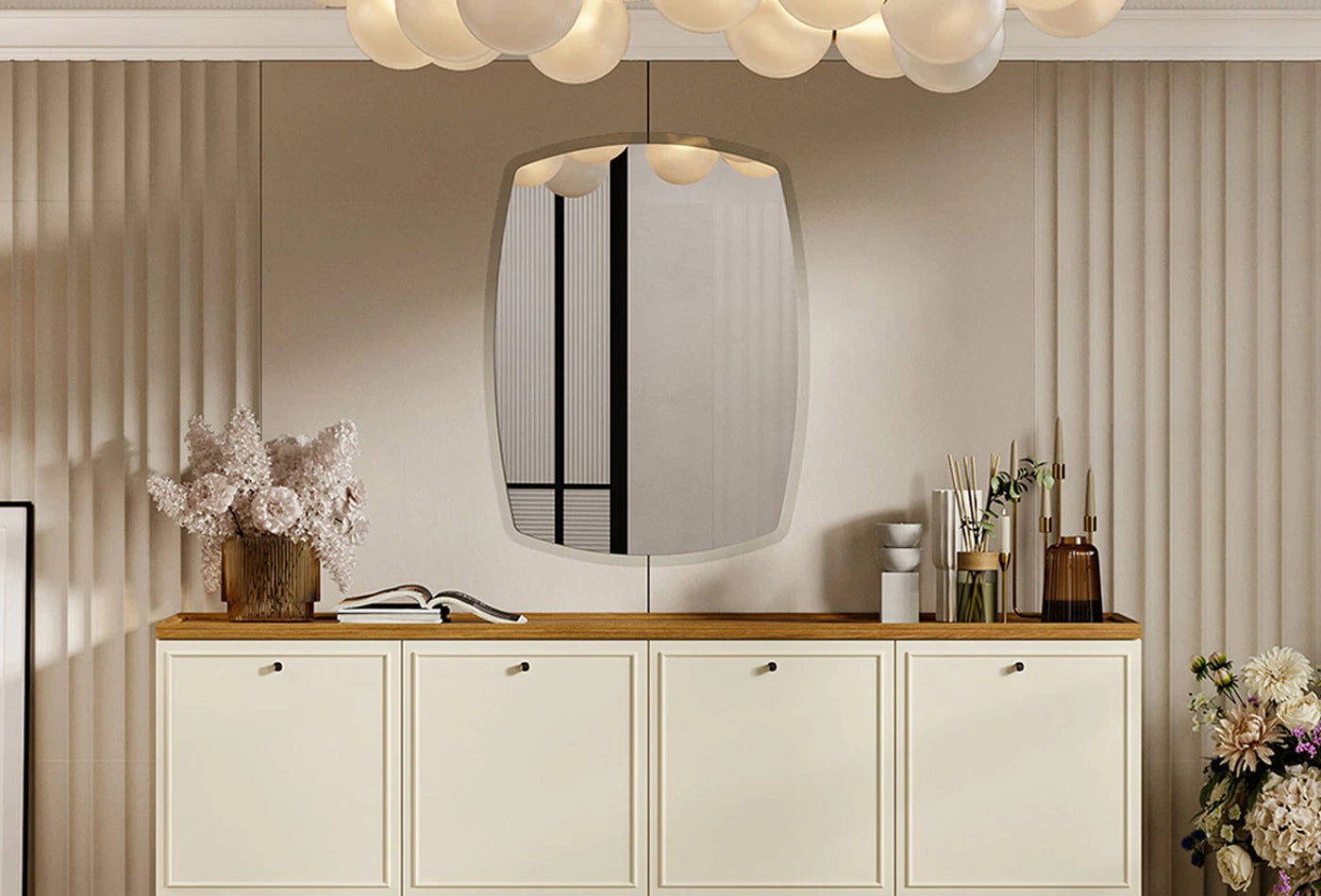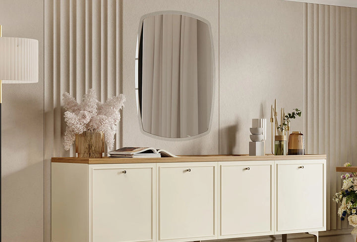 A dizájnt kiegészítő krém színű részletekkel ellátott tükör natúr textúrájával és elegáns keretével hívja fel magára a figyelmet.