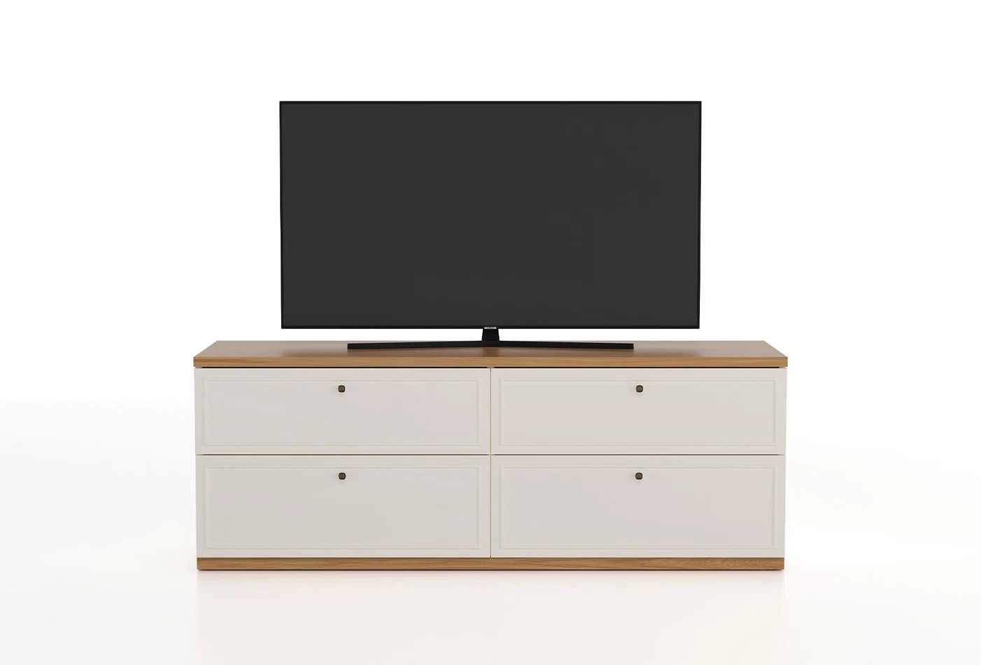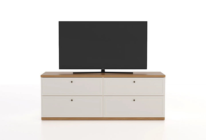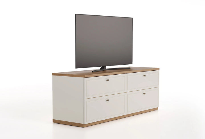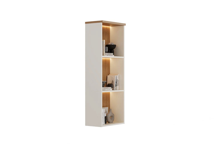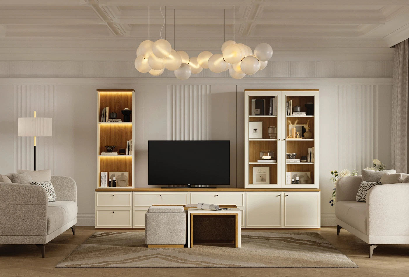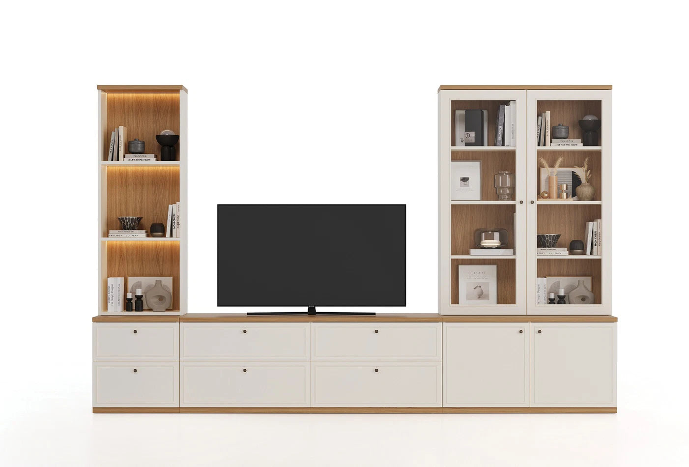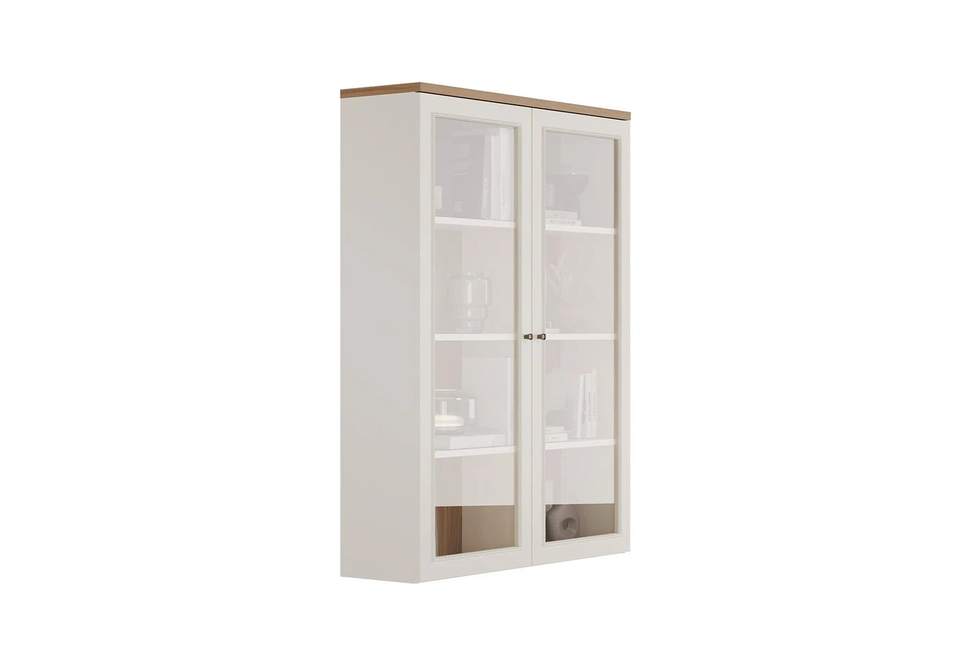 A country dizájn természetességét modern fa részletekkel ötvöző Marsana vitrines szekrénysor, tölgy és krém színkombinációjával esztétikus érintést kölcsönöz az élettereknek.