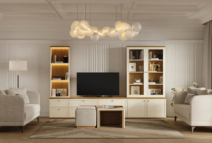 Nyérc szürke színű fém fogantyú dizájnjával figyelemre méltó Marsana vitrines szekrénysor, fiók részleteivel egyszerre kínál esztétikát és funkcionalitást.
