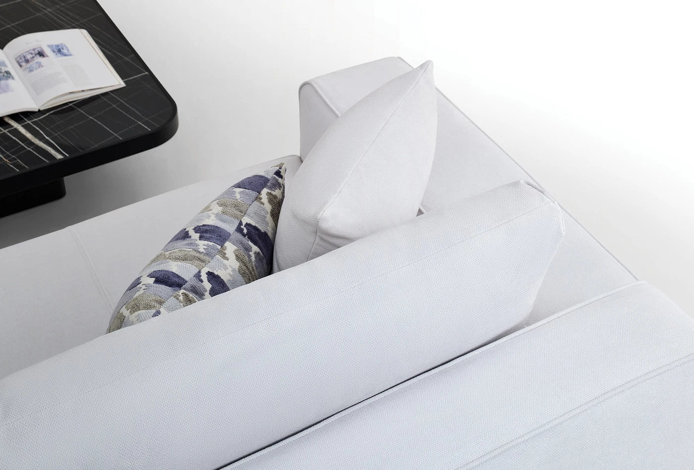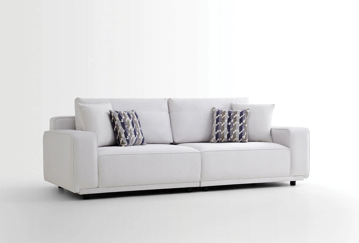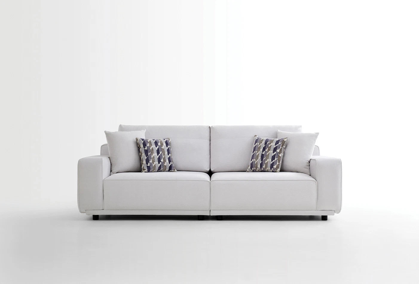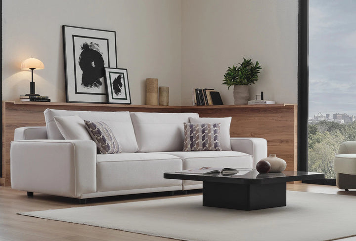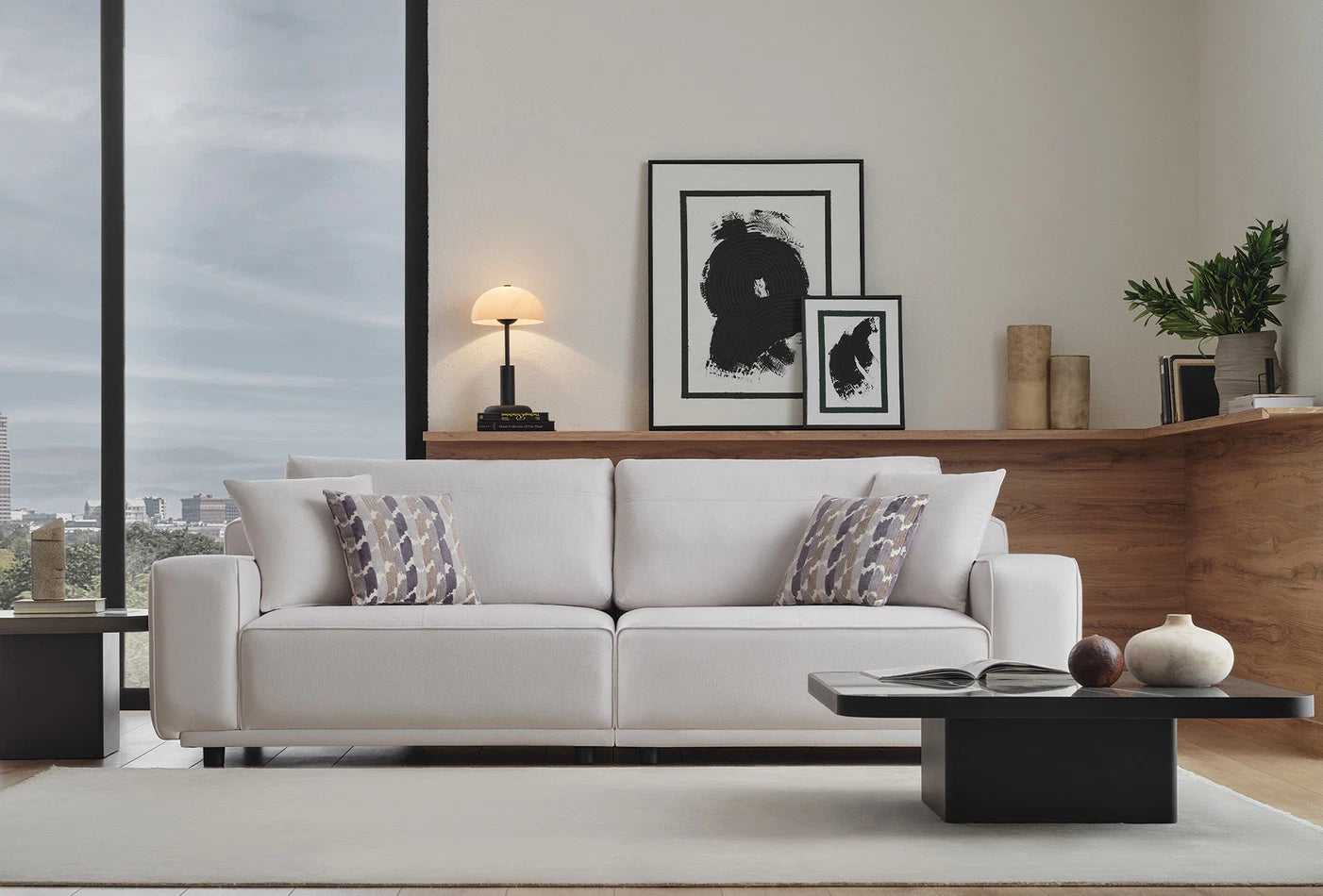 A MESTA 3 személyes kanapé fém alsó vázra épített fa szerkezettel rendelkezik a tartósságért, míg a padlóhoz közeli láthatatlan lábak modern és elegáns megjelenést kölcsönöznek neki. A letisztítható szövetnek köszönhetően praktikus a használata.