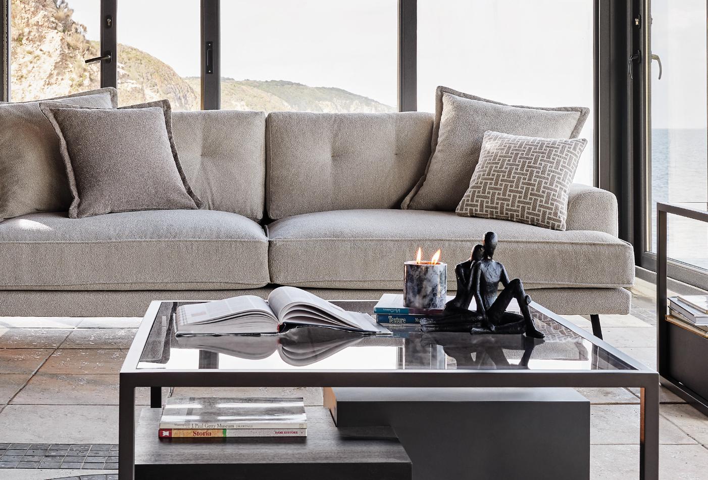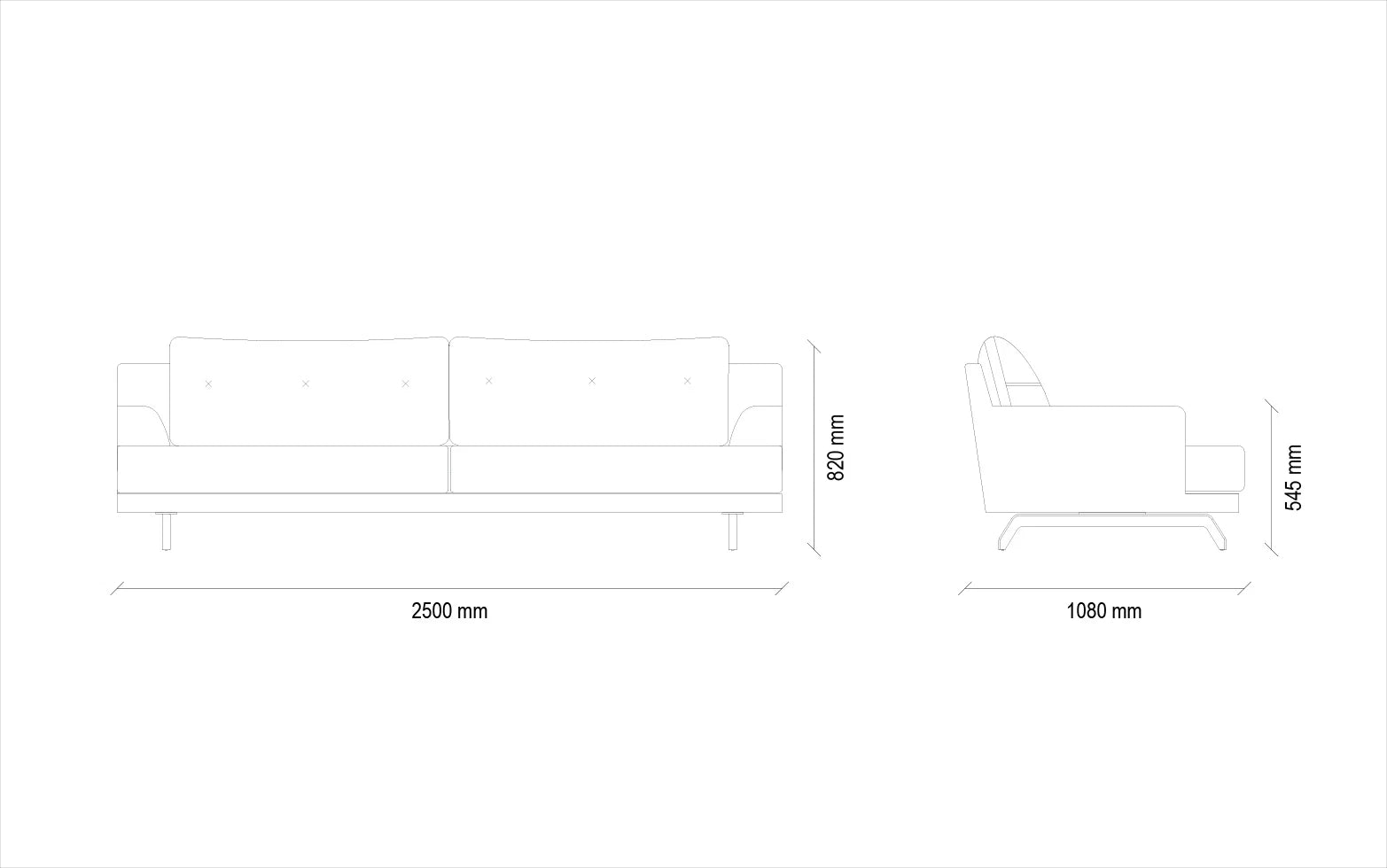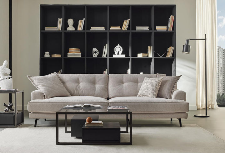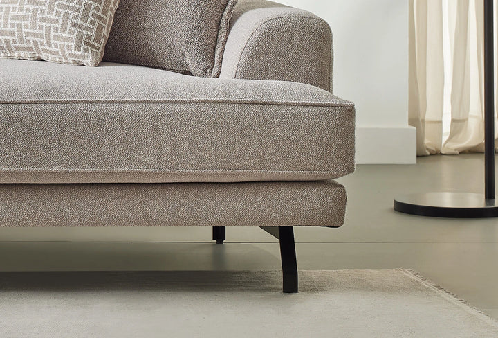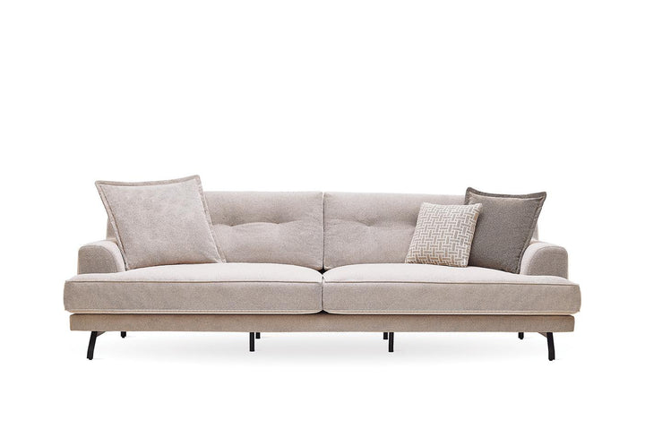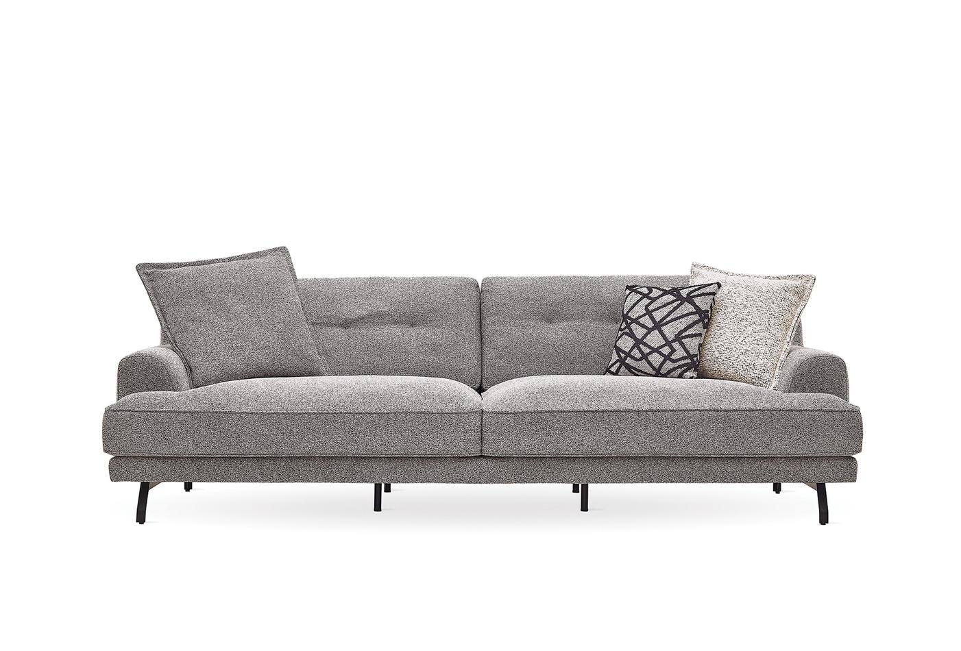 A MILAN 3 személyes kanapé három díszpárnával rendelkezik, amelyek közül kettő fodros. A fekete fém lábak esztétikus megjelenést kölcsönöznek a kanapénak, a magas lábak pedig megkönnyítik a takarítást.