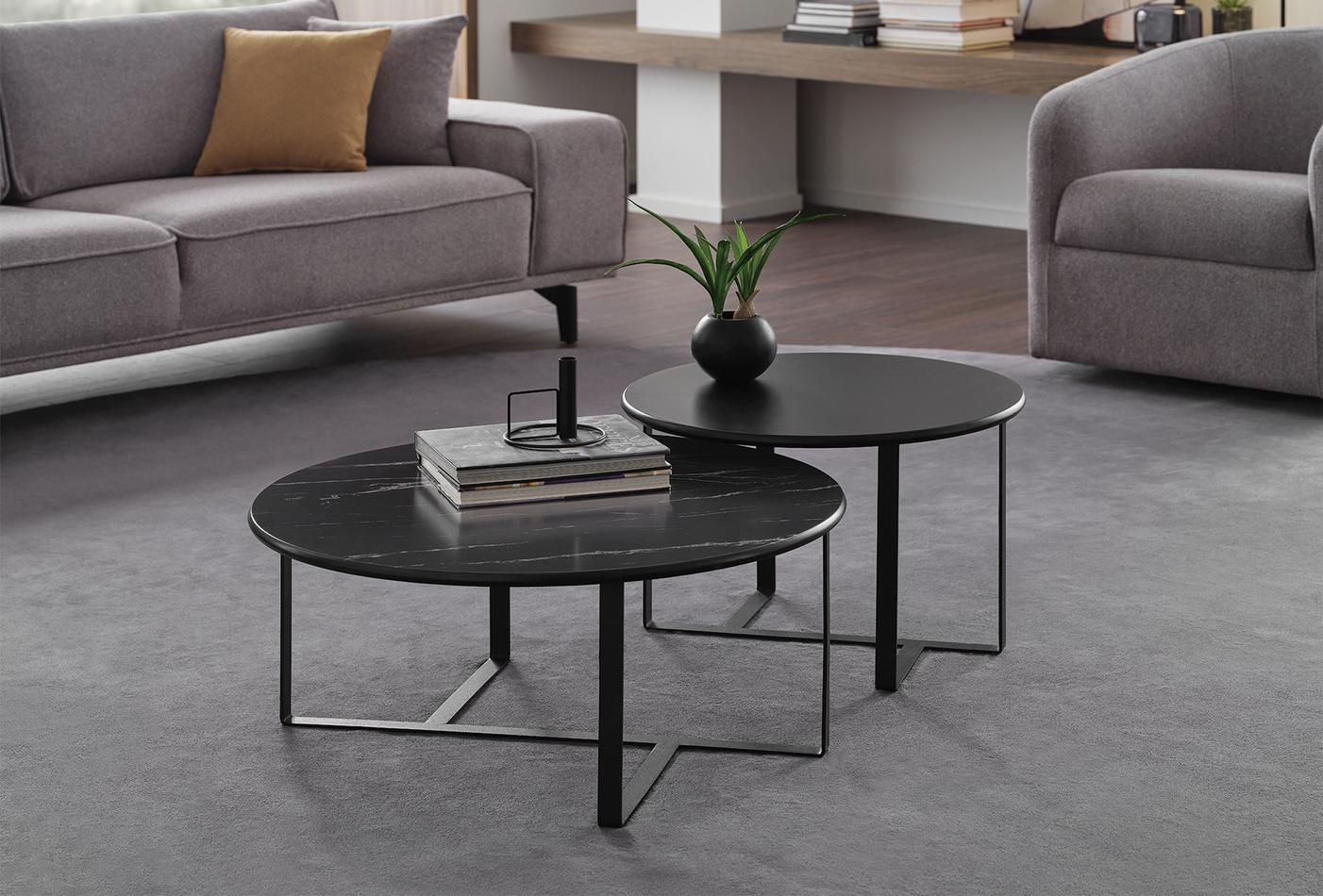 A 7 különböző modulból álló PADME DOHÁNYZÓASZTAL SZÉRIA modern dizájnjával és fekete fém lábaival egyedi dizájnt kínál. Különböző alternatívákat kínál amorf, kerek és ellipszis formákban, mind márványhatású felső felülettel, mind MDF-re lakkozott felülettel, így dizájnszabadságot biztosít a felhasználónak.