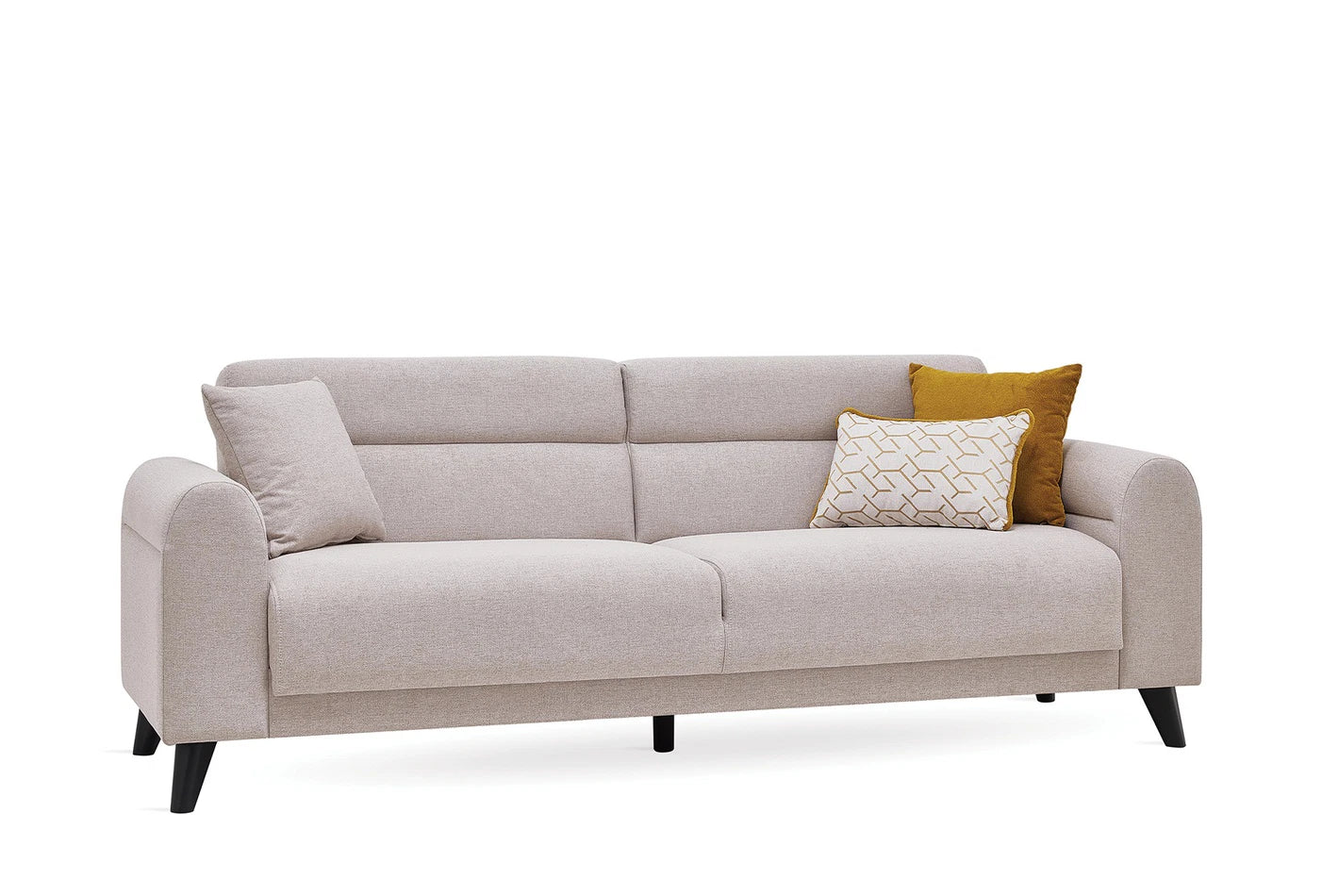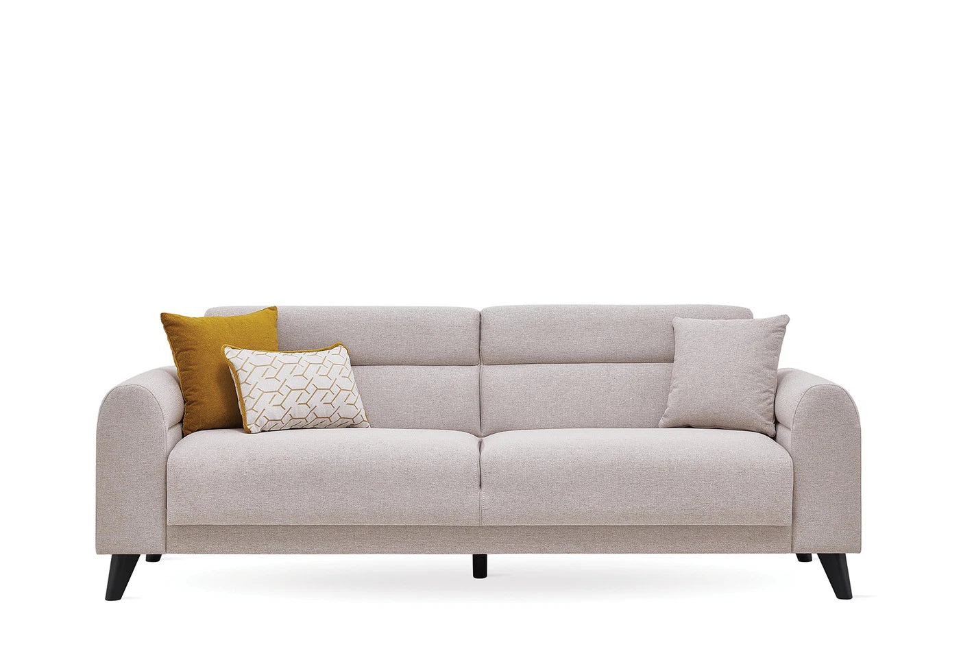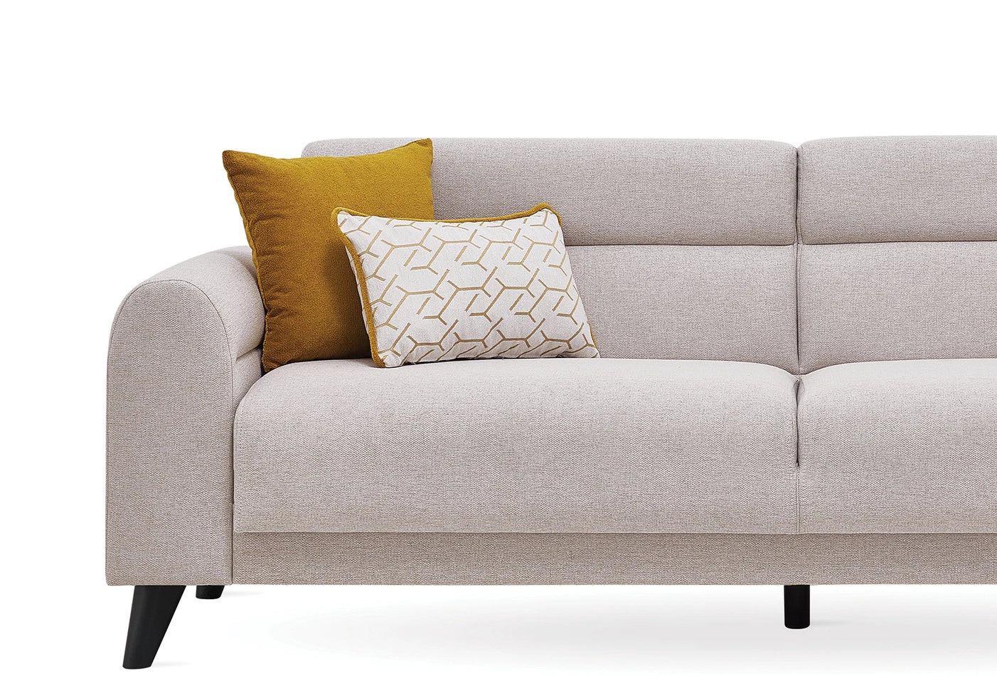 Klasszikus vonalat képvisel ék alakú antracitszürke lábaival és krém színű kárpitjával. Karfáját és háttámláját különleges varrások díszítik. Három díszpárnája még elegánsabbá teszi megjelenését.