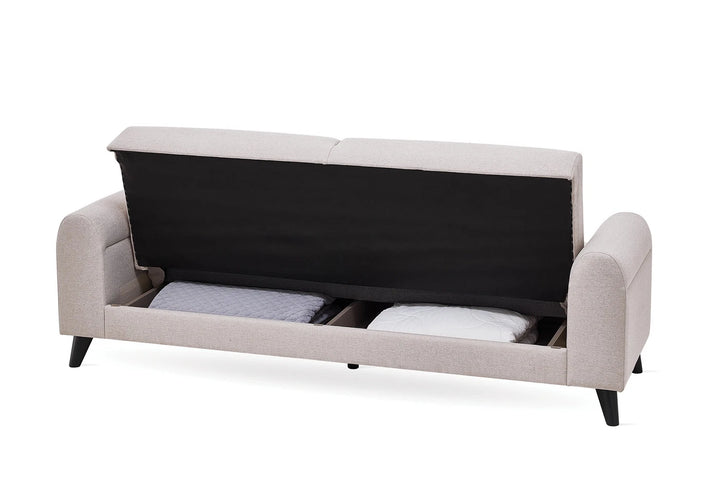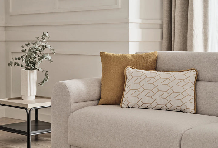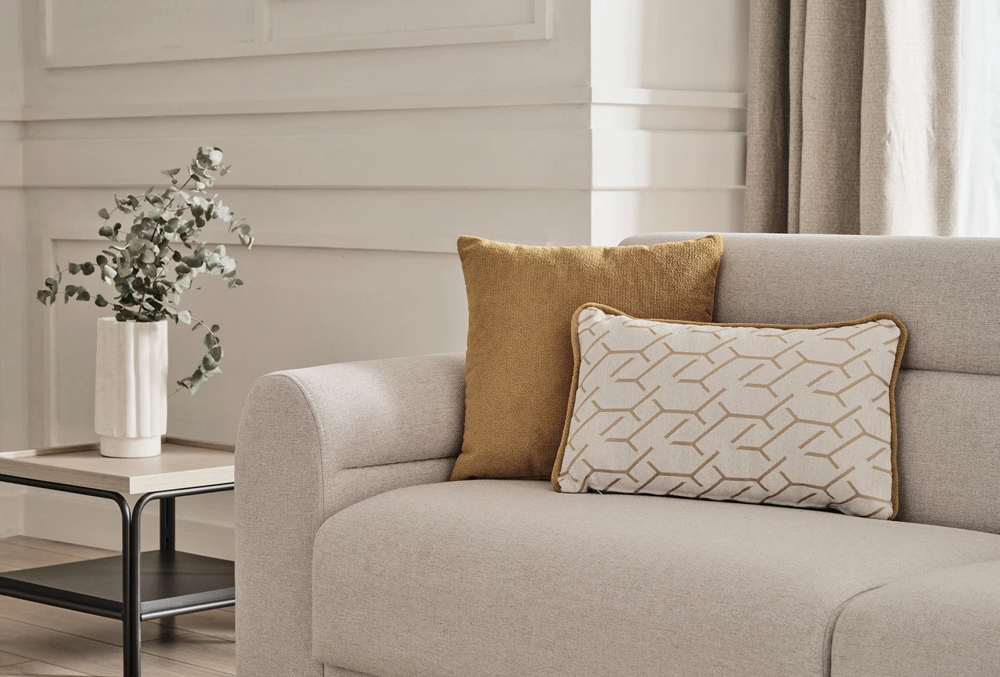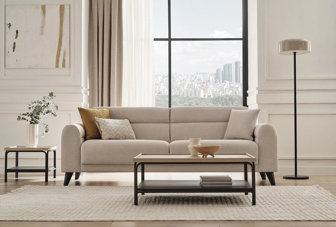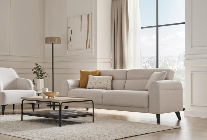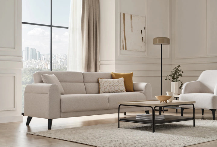 Klasszikus vonalat képvisel ék alakú antracitszürke lábaival és krém színű kárpitjával. Karfáját és háttámláját különleges varrások díszítik. Három díszpárnája még elegánsabbá teszi megjelenését.