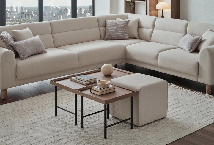 A PALOMA DOHÁNYZÓASZTAL, mély dió textúrájának gazdag tónusaival meleg atmoszférát teremt, miközben fém lábaival modern egyensúlyt hoz létre.