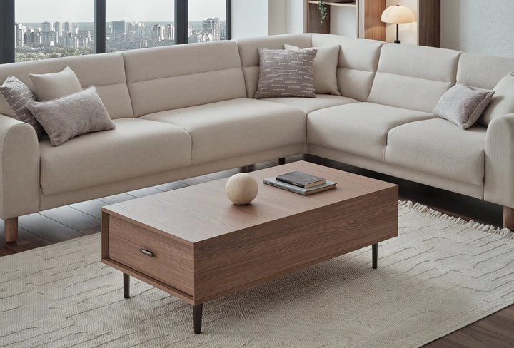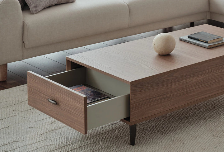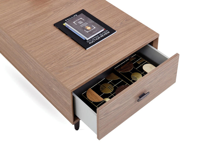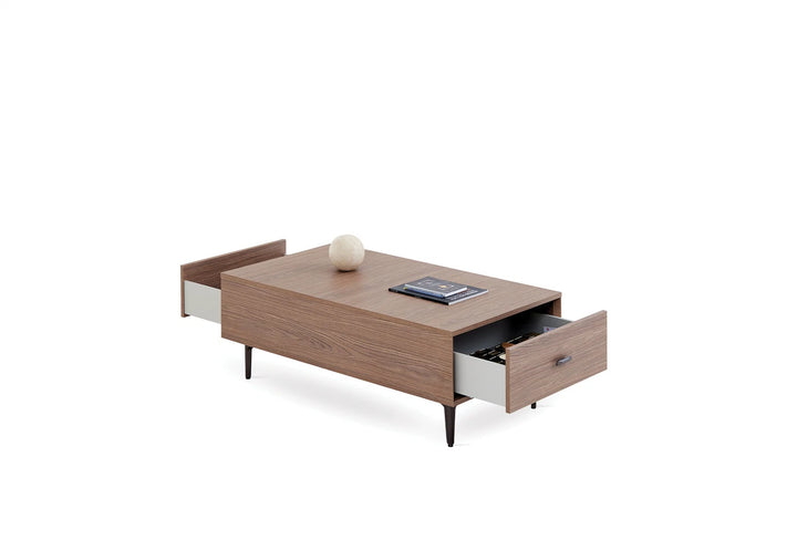 A PALOMA DOHÁNYZÓASZTAL, mély textúrájú dió színű dizájnjával modern eleganciát visz az életterekbe, miközben két fiókjával biztosítja a szükséges rendet.