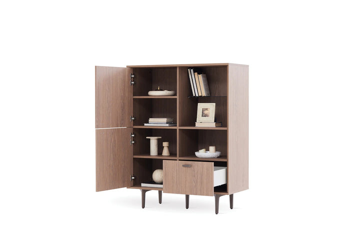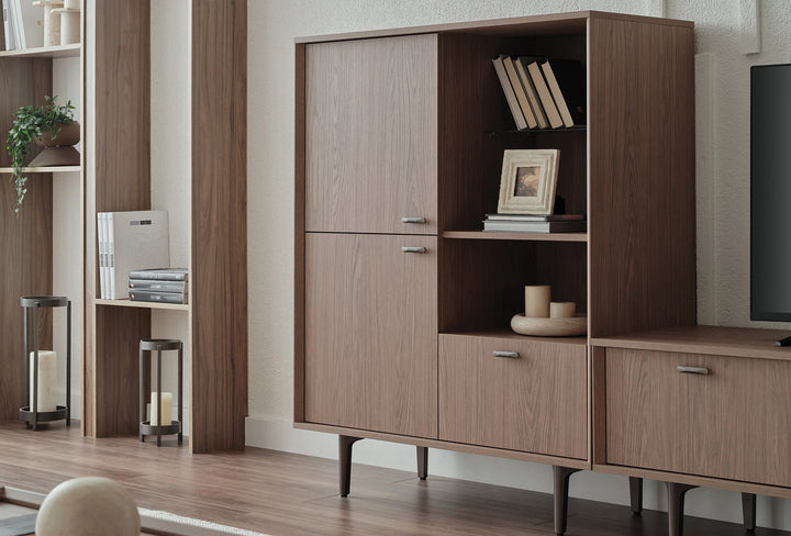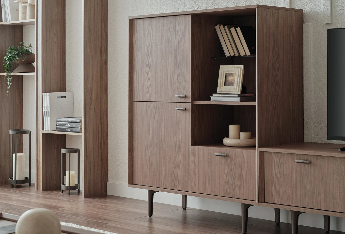Moduláris szerkezetének köszönhetően igény szerint alakítható PALOMA TV ÁLLVÁNY KÖNYVESPOLC MODUL, a könyvespolc részben található két fedeles résszel és egy fiókkal rendezett tárolási lehetőséget kínál, míg kávébarna fogantyúival és lábaival kiegészíti egyedi dizájnját.