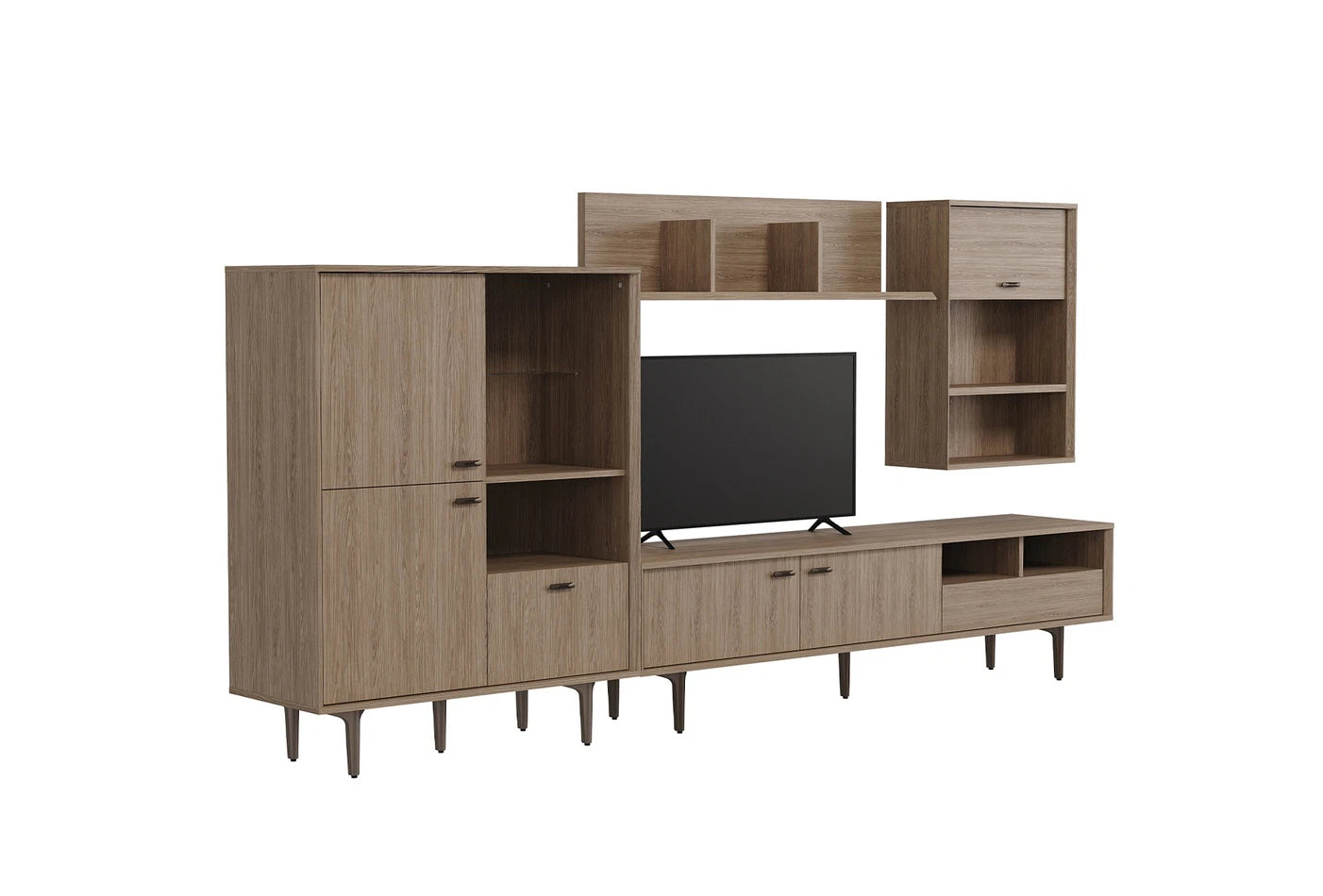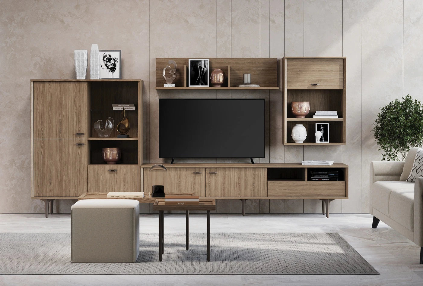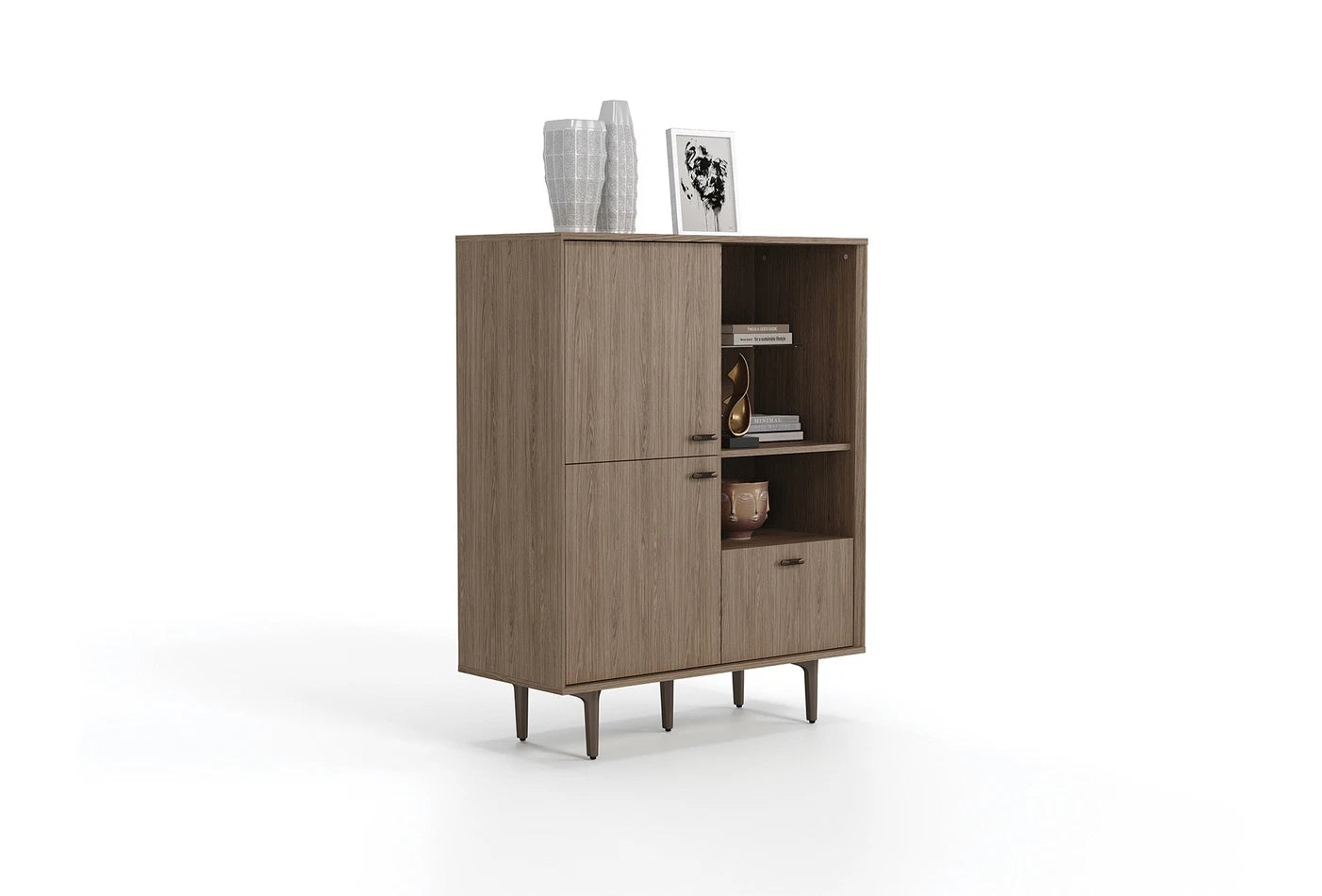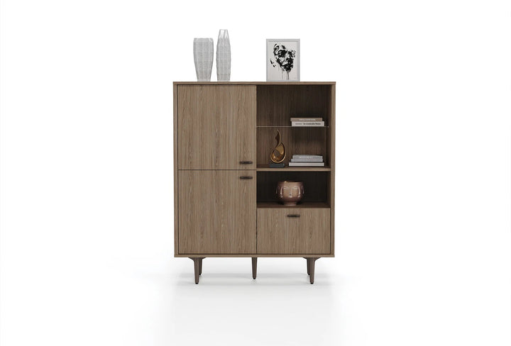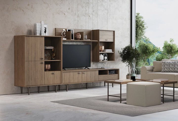 A PALOMA polcos szekrénysor a természetes dió szín mély textúrájával melegséget és eleganciát sugároz minden sarokban, miközben a különlegesen szögletes oldalsó elemek modern karaktert kölcsönöznek a dizájnnak.