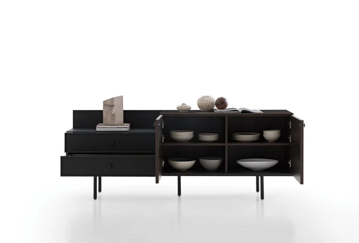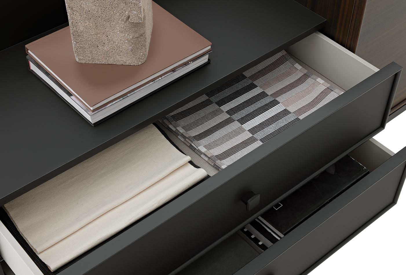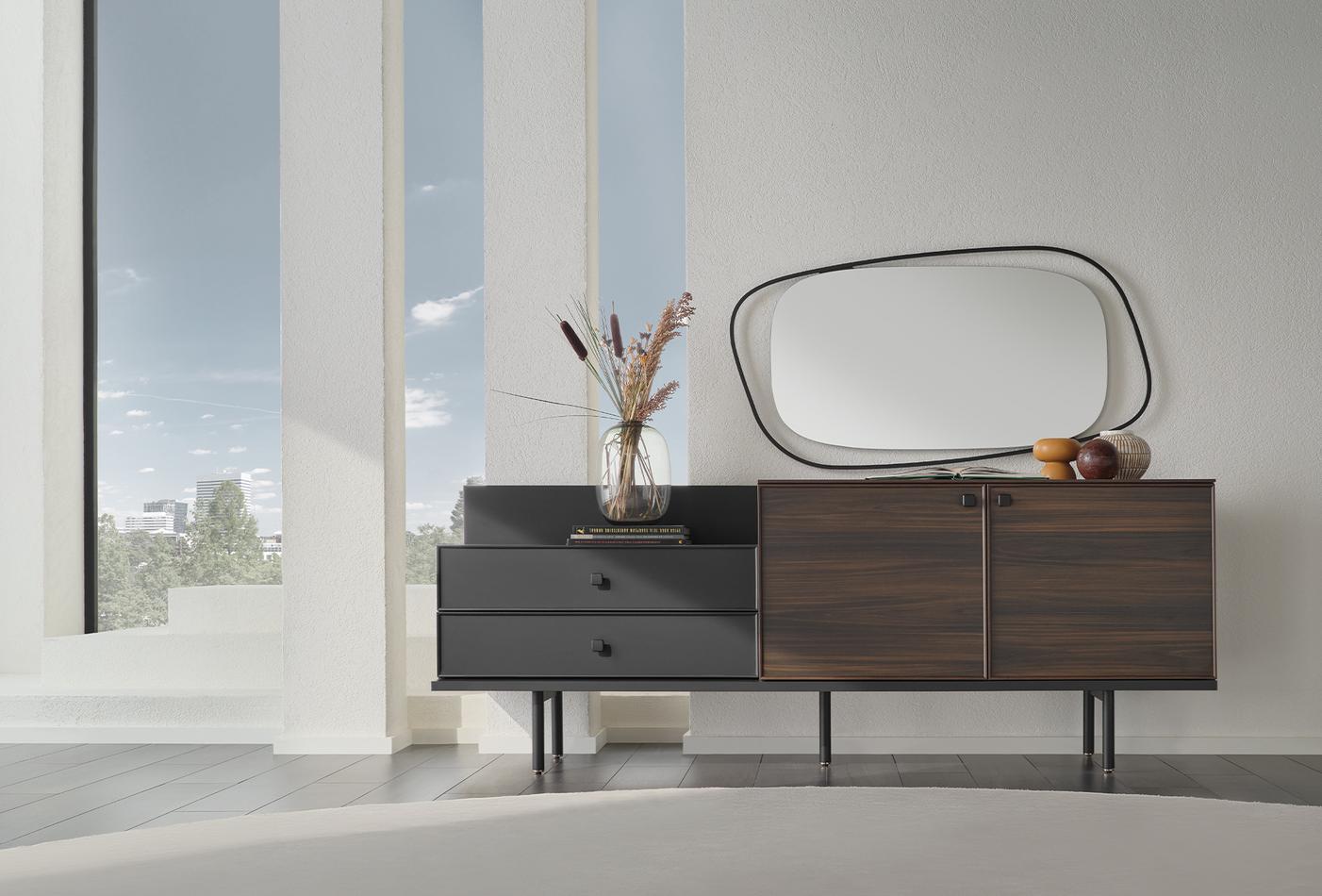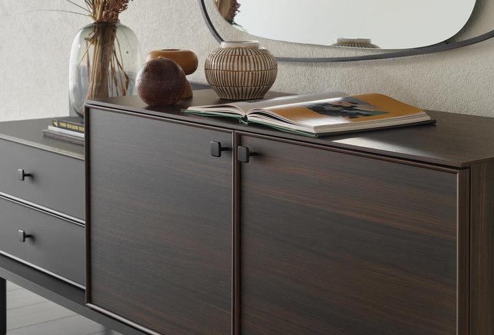 A PARMA TÁLALÓSZEKRÉNY a sötét diófa és a matt fekete egyedi színkombinációjának köszönhetően a legmodernebb lakóterekben is megállja a helyét.