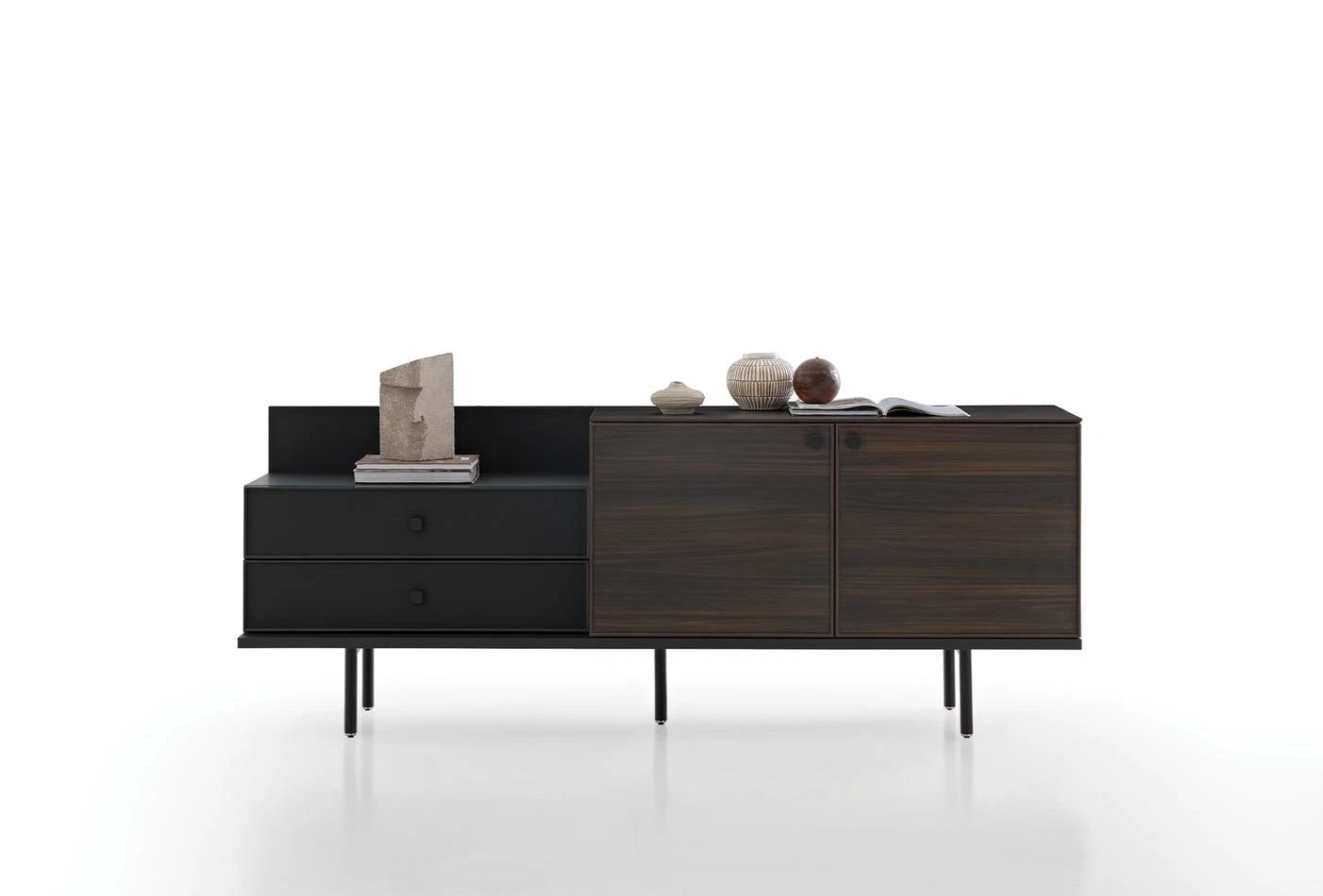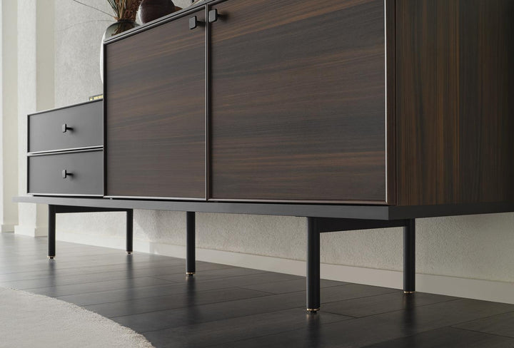 Masszív kialakítása miatt időtálló. Különleges dizájnelemekből sincsen hiány: az ajtókon és a fiókokon fém fogantyúk, a fém lábakon pedig bronz papucsok.