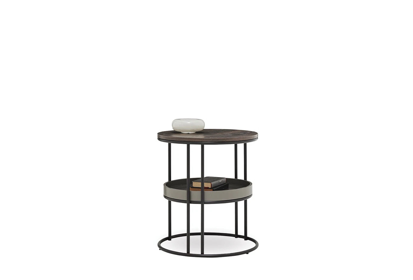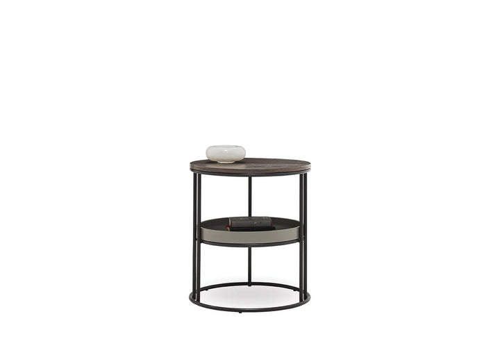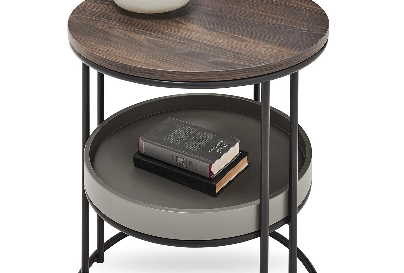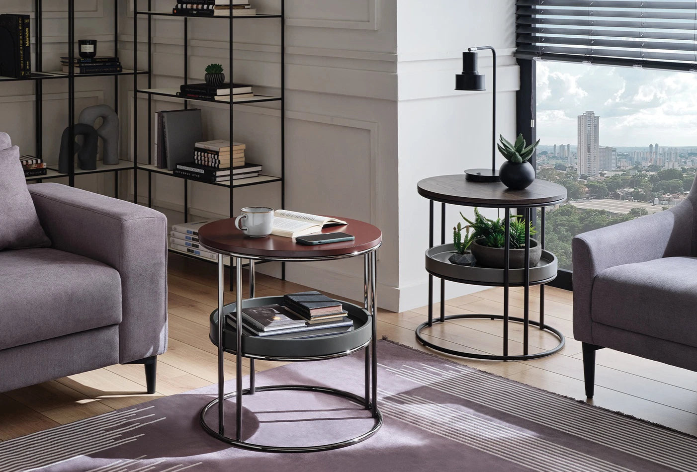 A feltűnő dió színével dinamikus kiegészítővé váló PERA DOHÁNYZÓASZTAL, kerek formájával eleganciát és a polcos dizájnjának funkcionalitásával hívja fel magára a figyelmet. Ipari fa felső felületével és fém lábaival a PERA DOHÁNYZÓASZTAL esztétikus megjelenéssel emelkedik ki.