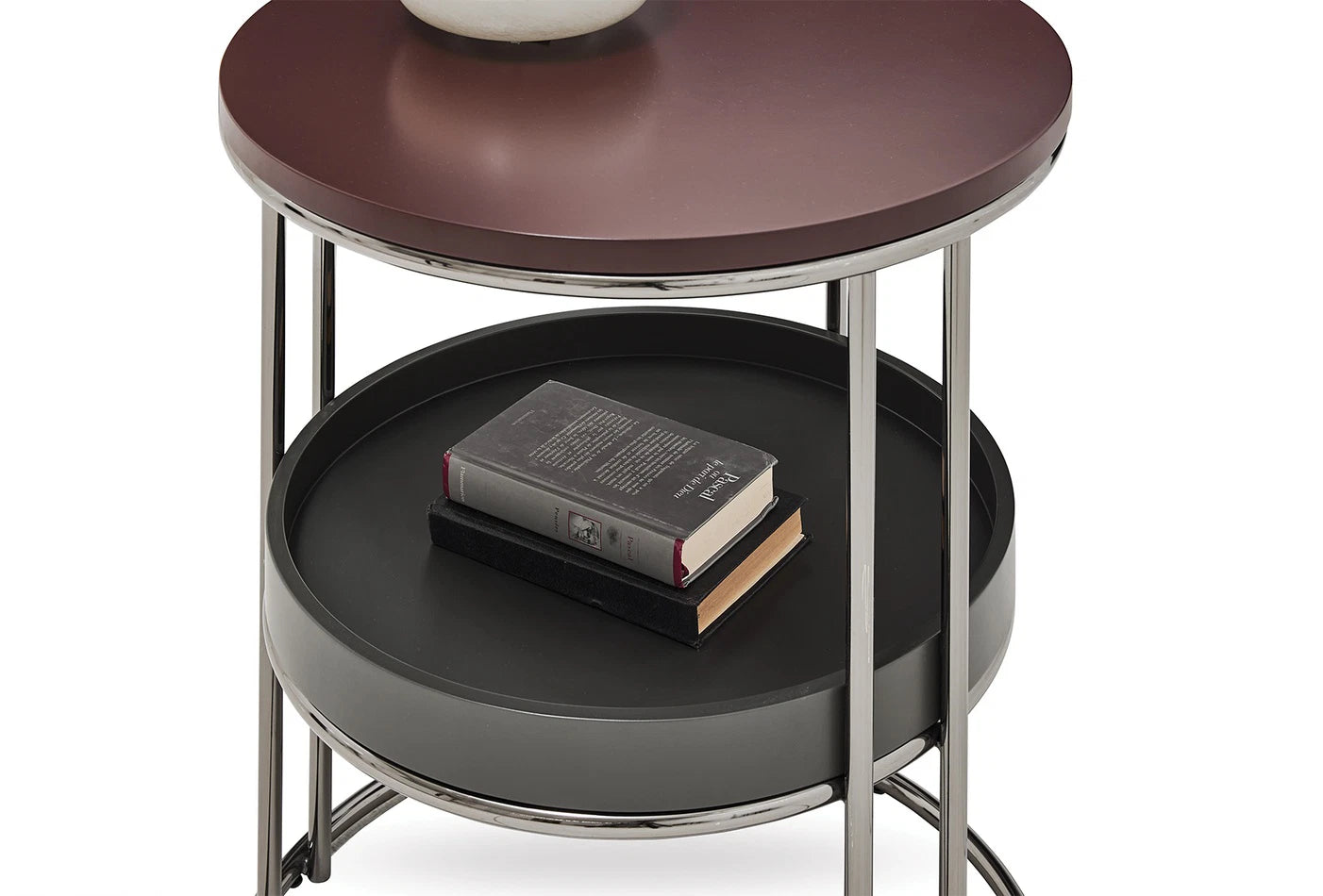 A feltűnő bordó színével dinamikus kiegészítővé váló PERA DOHÁNYZÓASZTAL, kerek formájával eleganciát és a polcos dizájnjának funkcionalitásával hívja fel magára a figyelmet. MDF lakozott felső felületével és füstszínű bevonatú fém lábaival a PERA DOHÁNYZÓASZTAL esztétikus megjelenéssel emelkedik ki.