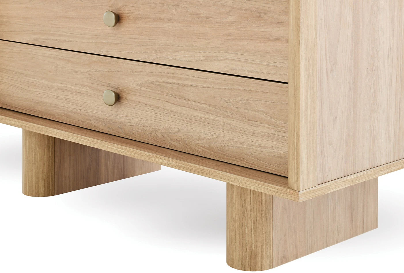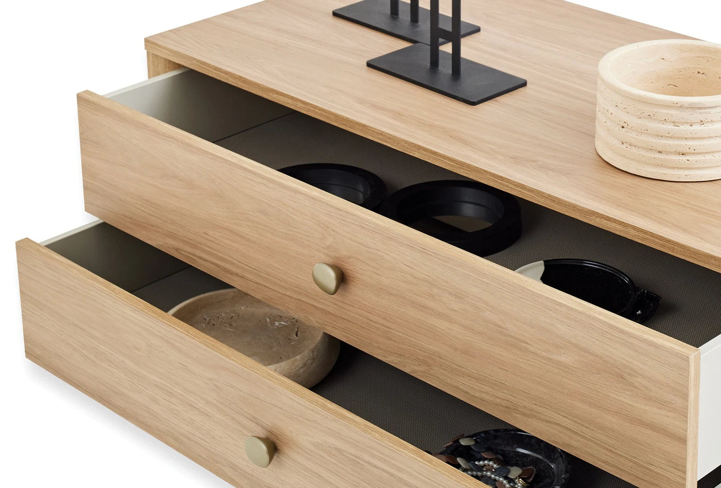 A fémes vizon színű fém fogantyúkkal és MDF sarokláb profilokkal kiegészített dizájn, a lassítóval ellátott sínrendszernek köszönhetően kifogástalan használati élményt nyújt.