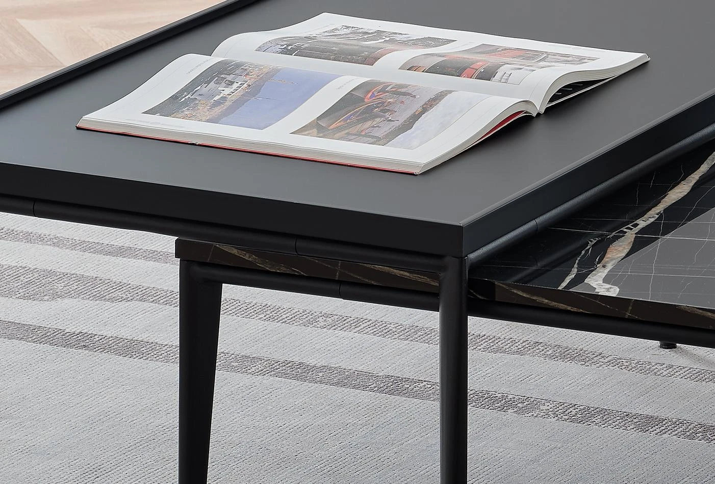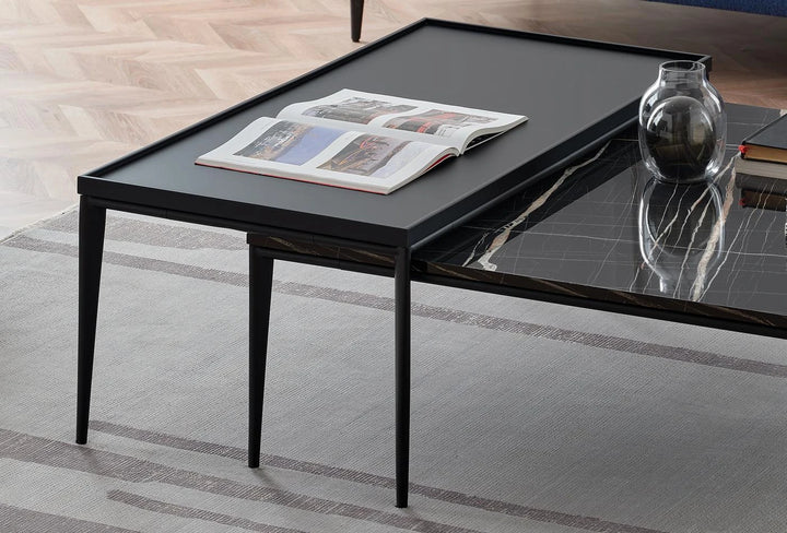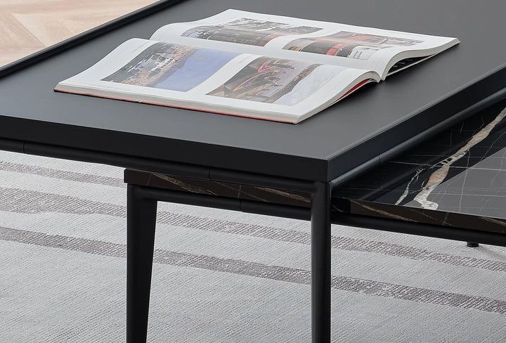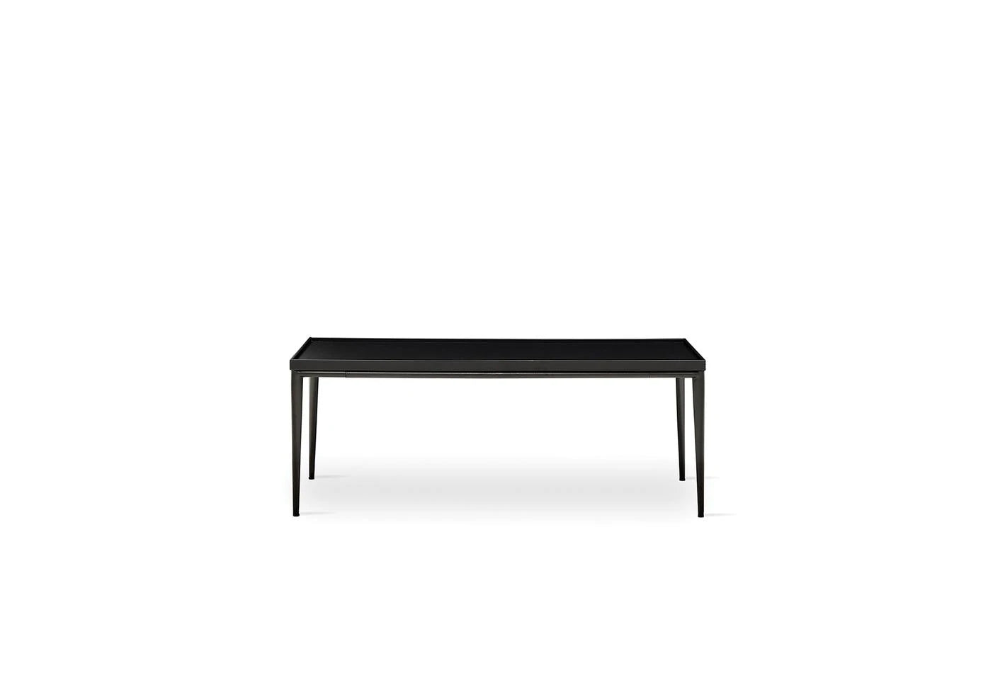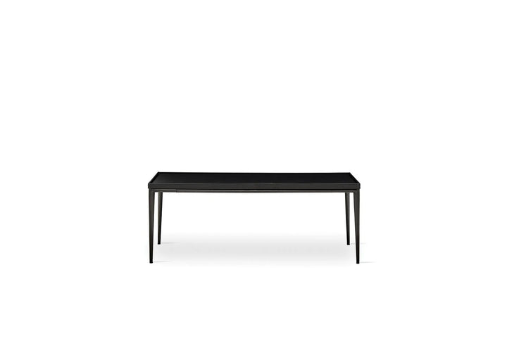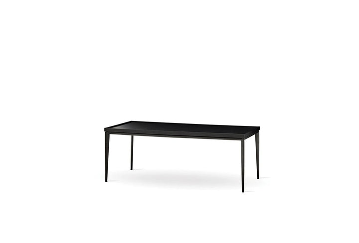 Az exkluzív anyagok felhasználásával kialakított, matt fekete felületű asztal letisztult stílust képvisel. A fekete asztallap MDF-fel keretezett, téglalap alakú, lába pedig fém.