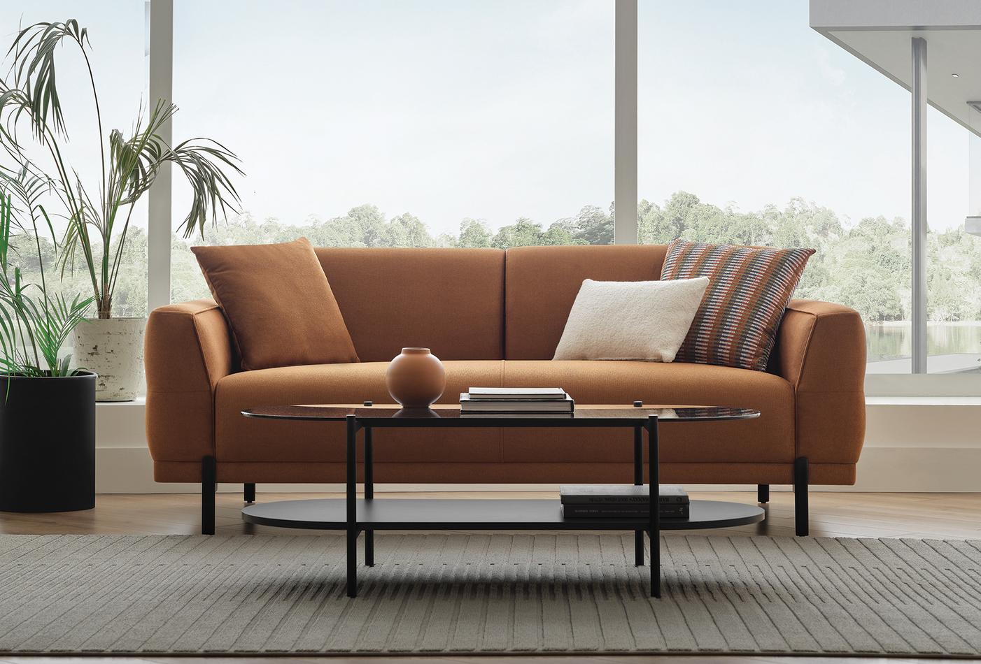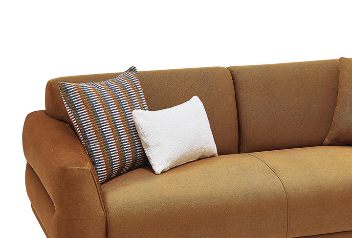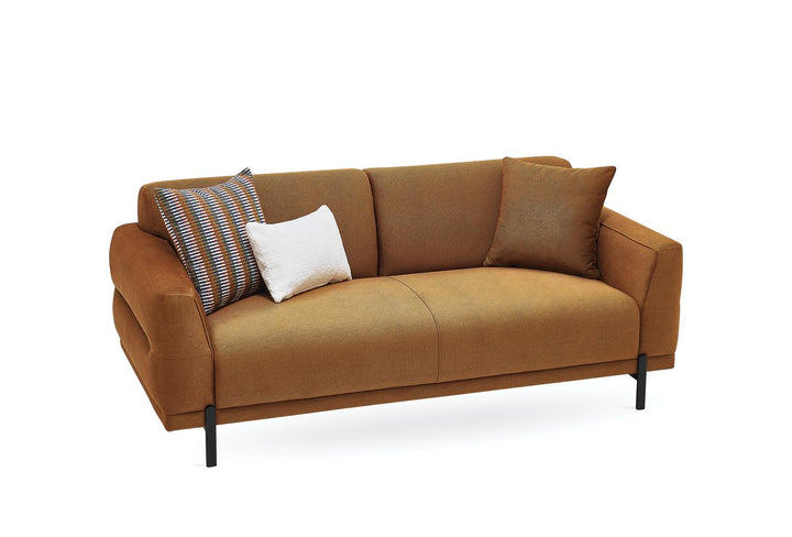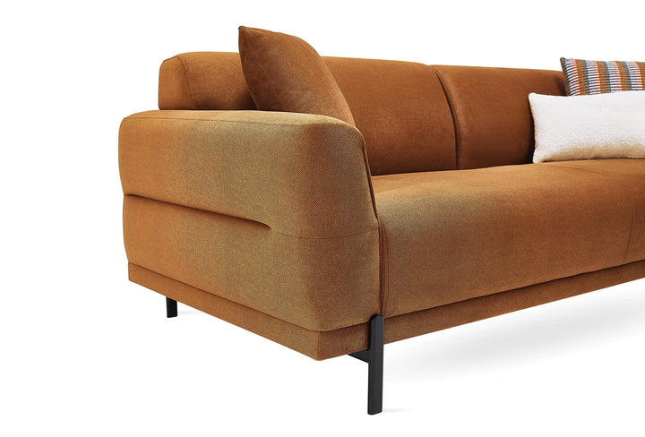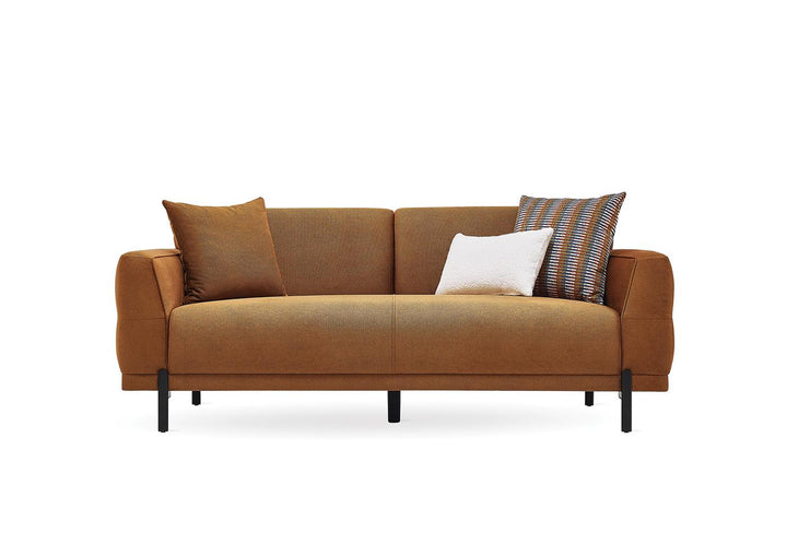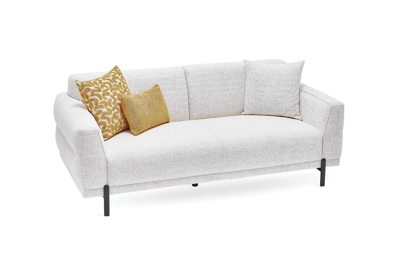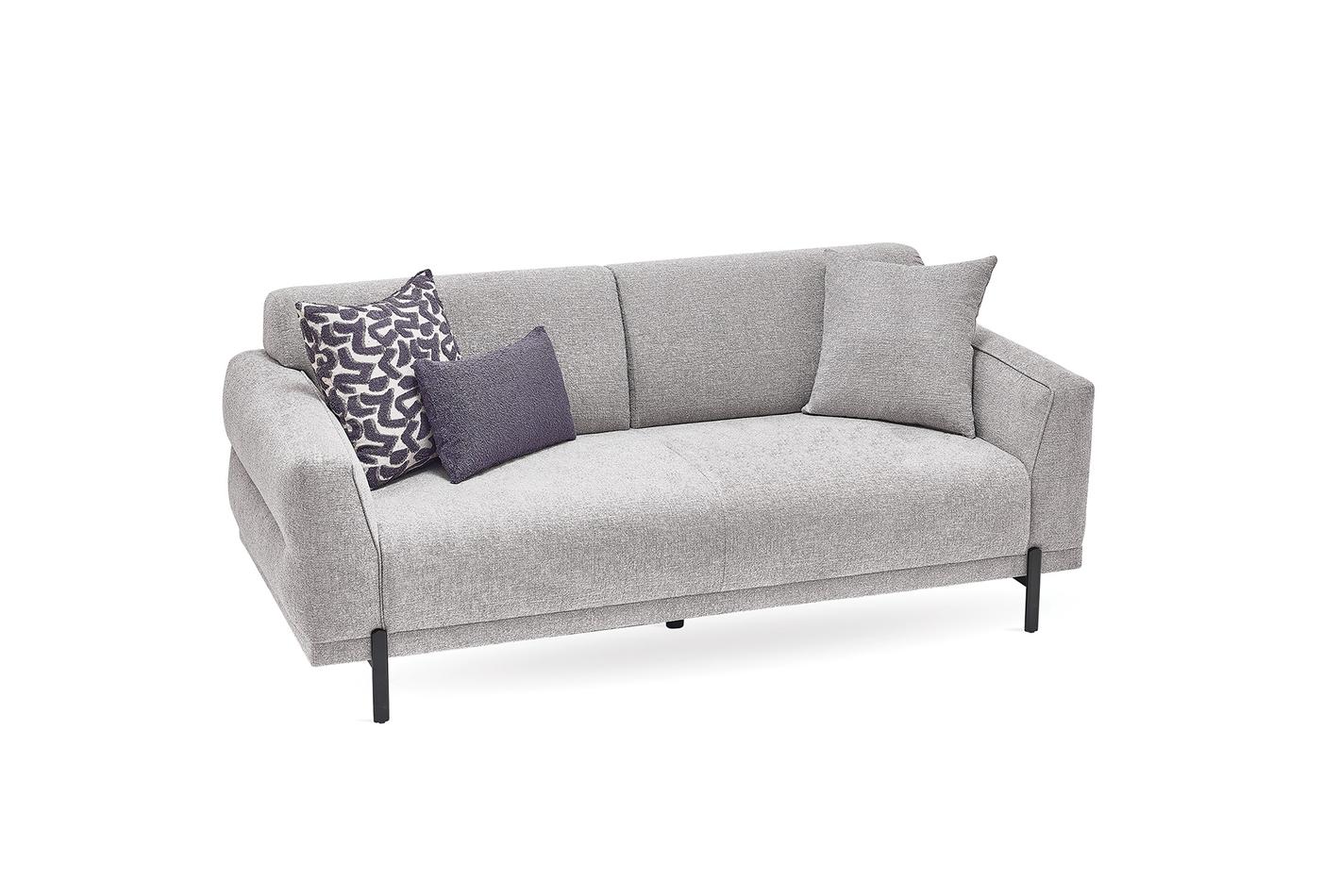 A fekete fém lábak és a 3 darab díszpárna gazdag esztétikai megjelenést kölcsönöznek, míg a magas lábak és a könnyen tisztítható szövet praktikus tisztítási előnyöket biztosítanak.
