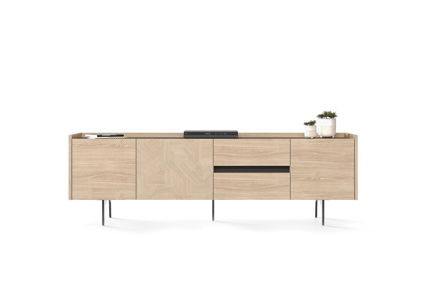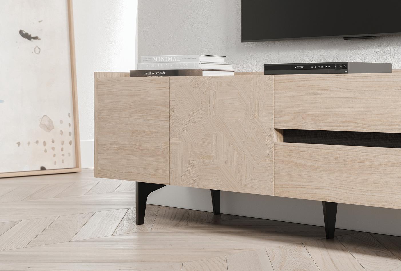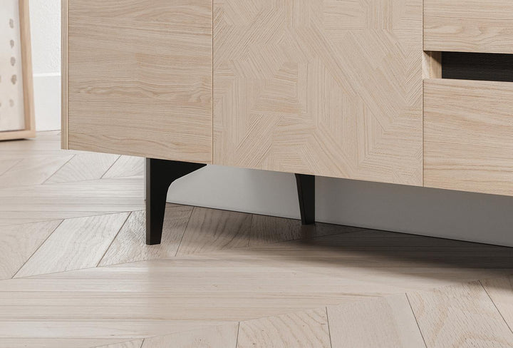 Az egyik ajtón található fa geometriai mintázat és a felső felület textil hatású bevonata tovább fokozza a szekrény eleganciáját. Az ajtóban elhelyezett LED világítás modern stílust kölcsönöz.