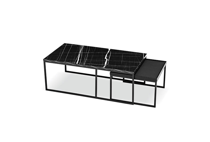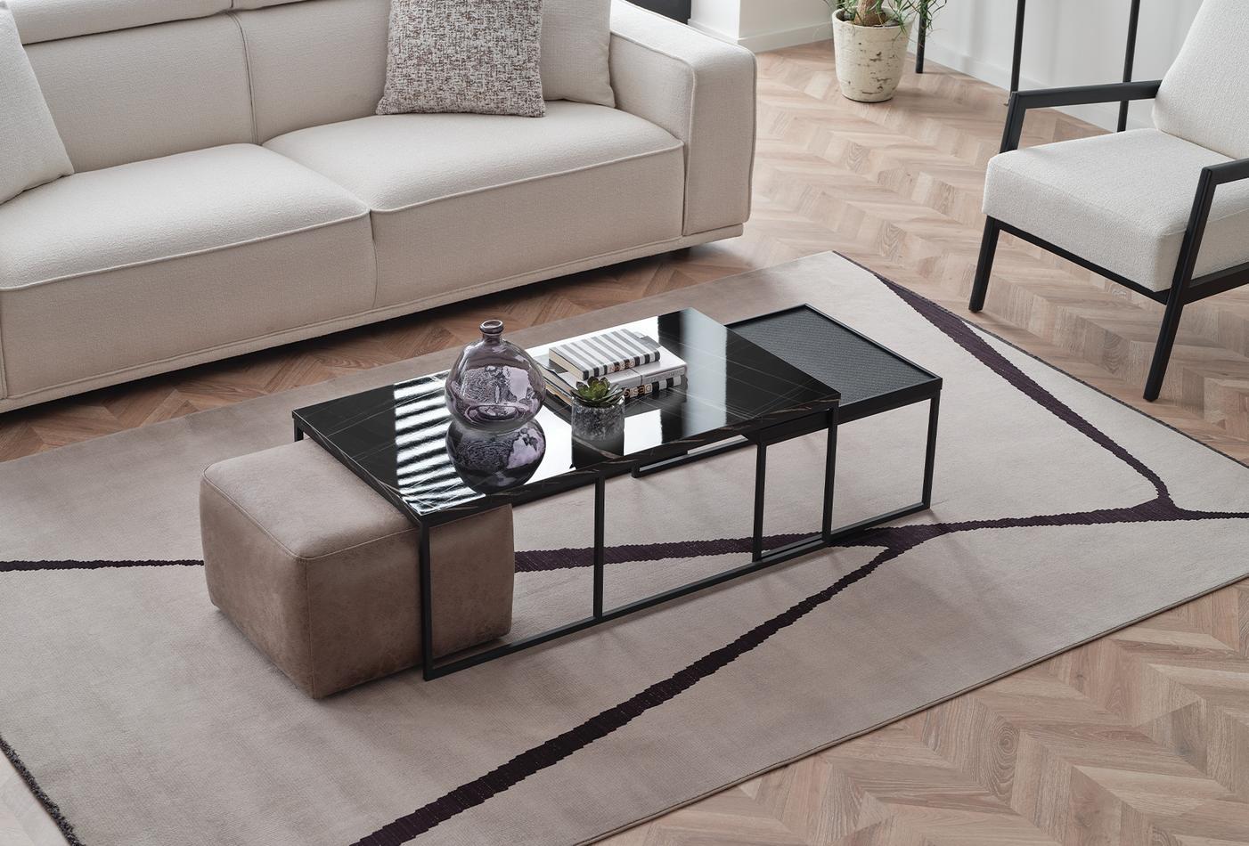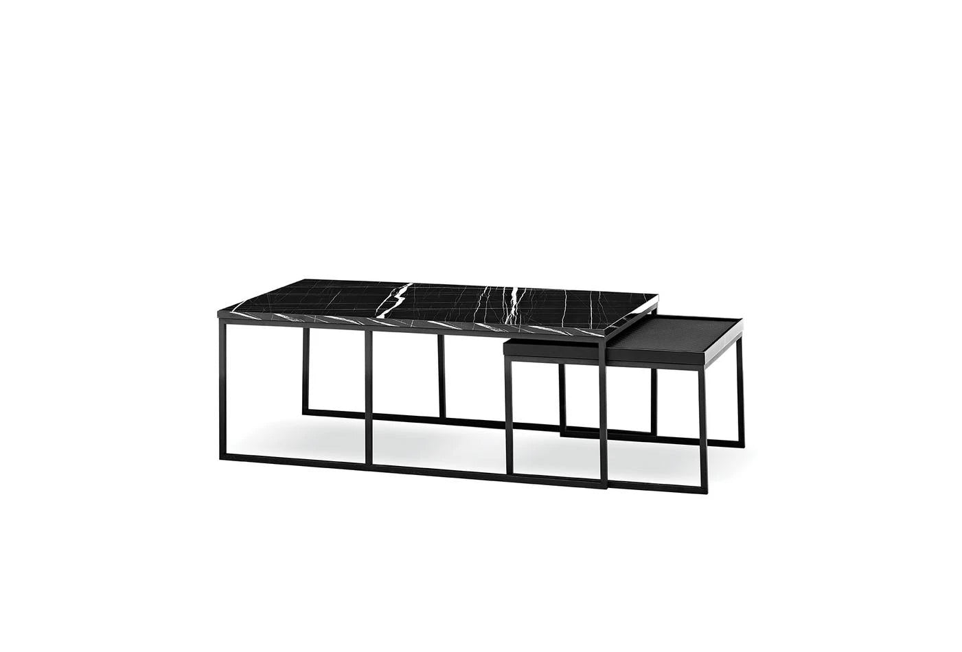 A modern dizájnvonalat funkcionális előnyökkel ötvöző TORIO DOHÁNYZÓASZTAL, fekete márványmintás felületű téglalap és fekete bőrutánzatú négyzetes felületű alkalmazásaival gazdag látványt visz az életterekbe.