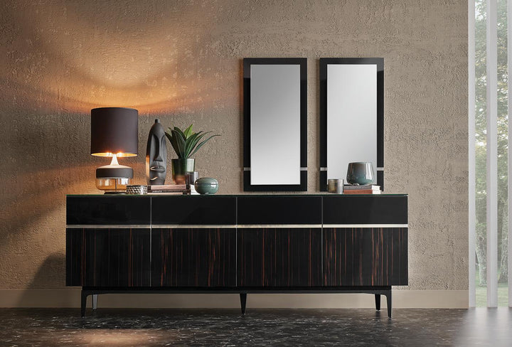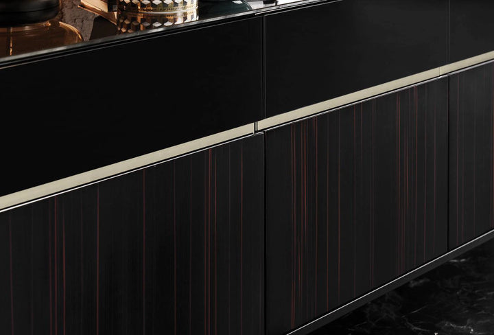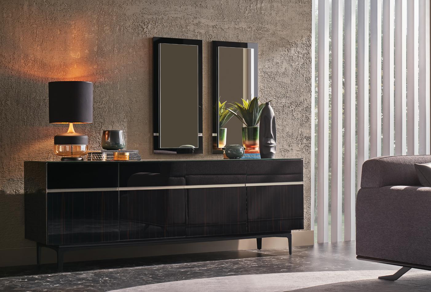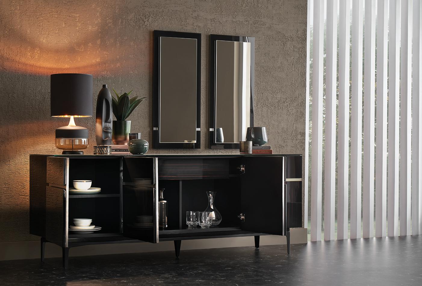 Az ébenfa, fekete üveg és speciális szatén dekoratív festék kombinációját gazdag és minőségi dizájn részletekkel ötvöző VALDERA TÁLALÓSZEKRÉNY fényűző stílusával, pompás;érintéseivel hívja fel magára a figyelmet.