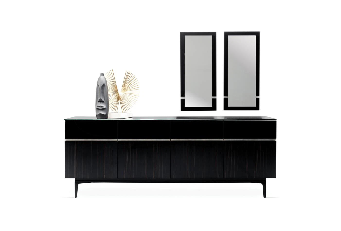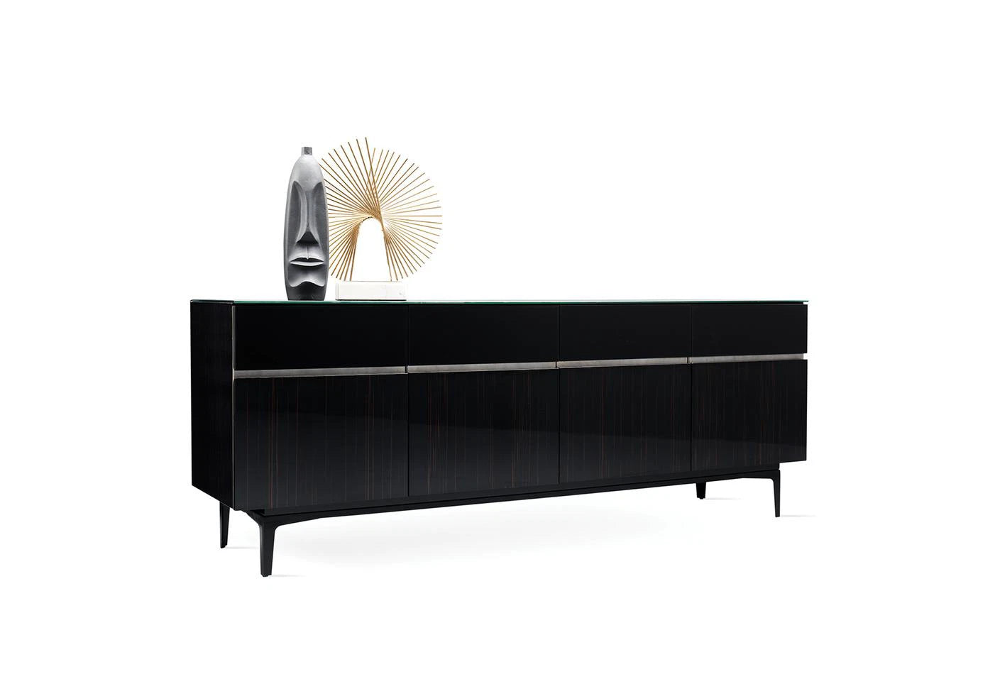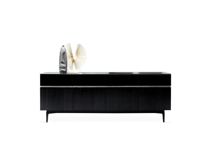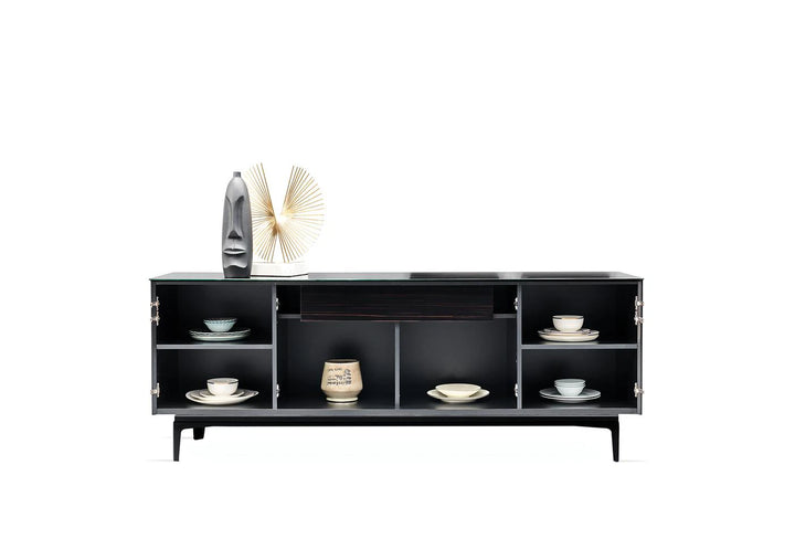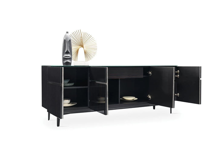 Az ébenfa, fekete üveg és speciális szatén dekoratív festék kombinációját gazdag és minőségi dizájn részletekkel ötvöző VALDERA TÁLALÓSZEKRÉNY fényűző stílusával, pompás;érintéseivel hívja fel magára a figyelmet.